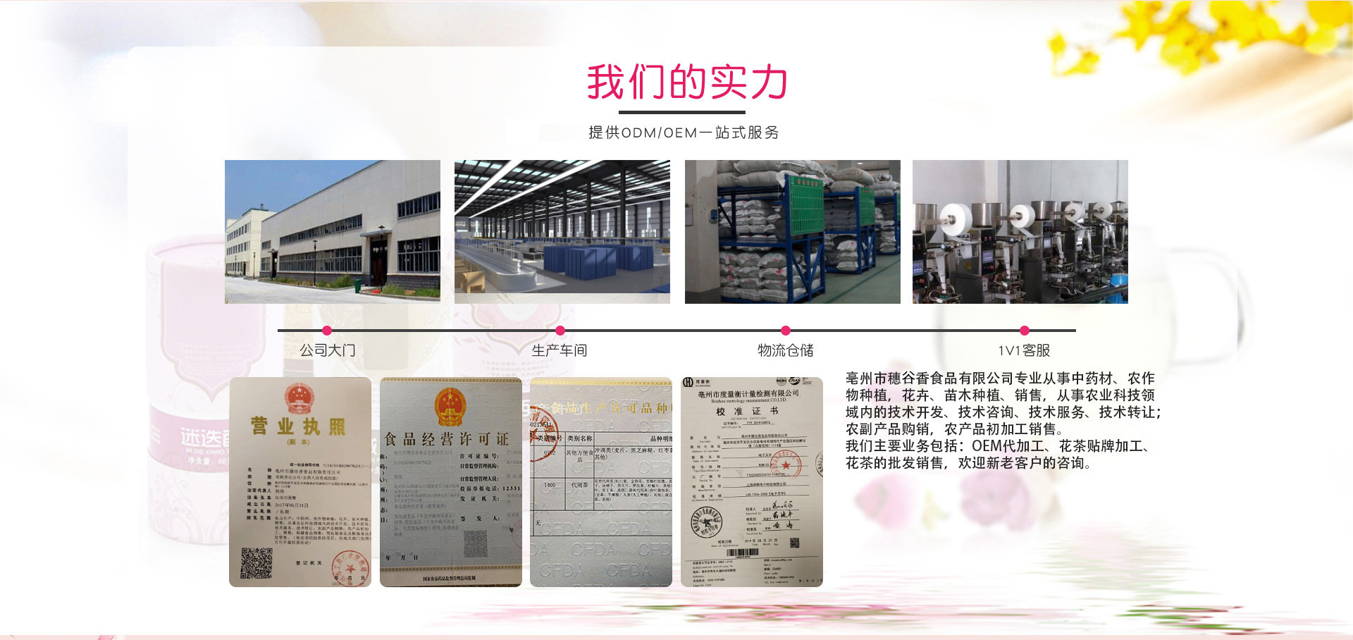 亳州市穗谷香食品有限責任公司是花茶、中藥、滋補品等產品專業生產加工的公司,擁有完整、科學的質量管理體系。亳州市穗谷香食品有限責任公司的誠信、實力和產品質量獲得業界的認可。歡迎各界朋友蒞臨參觀、指導和業務洽談。