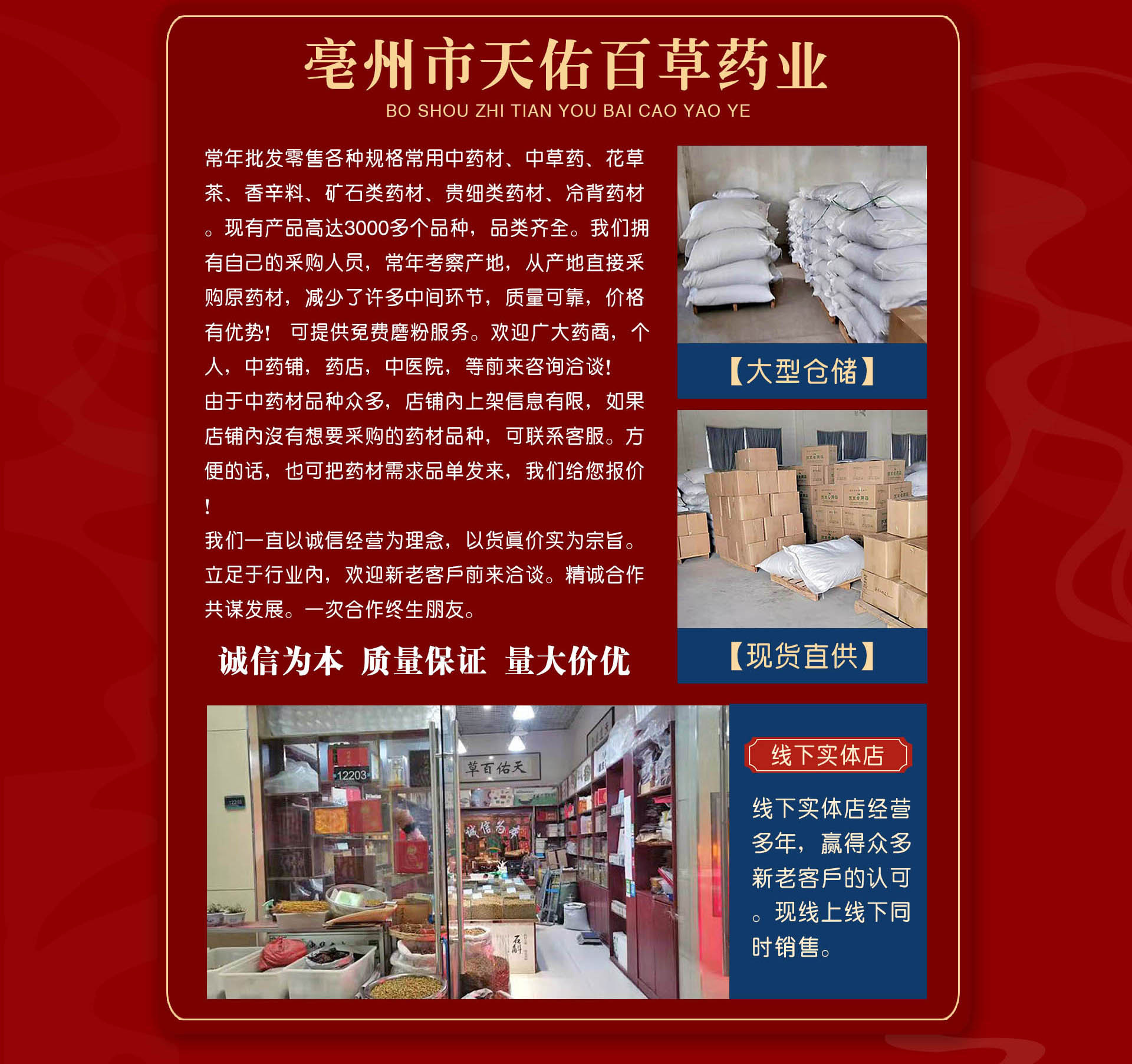 亳州市天佑百草藥業 經銷批發的中藥材、冷背中藥材、植物藥材暢銷消費者市場,在消費者當中享有較高的地位,公司與多家零售商和代理商建立了長期穩定的合作關系。亳州市天佑百草藥業經銷的中藥材、冷背中藥材、植物藥材品種齊全、價格合理。亳州市天佑百草藥業實力雄厚,重信用、守合同、保證產品質量,以多品種經營特色和薄利多銷的原則,贏得了廣大客戶的信任。