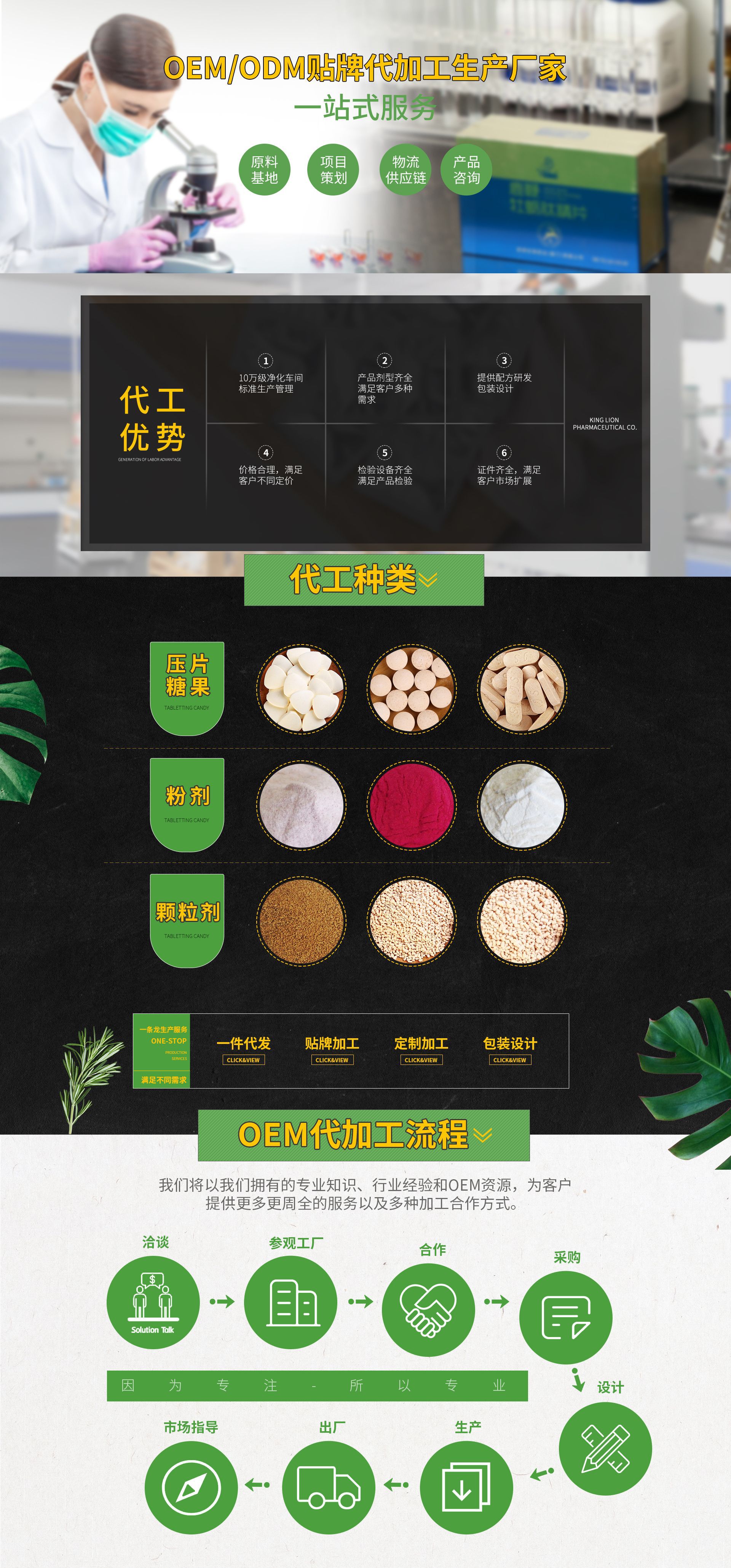 君獅生物藥業(yè)(廈門(mén))有限公司,我司是一家專(zhuān)業(yè)從事健康食品,集研發(fā)、生產(chǎn)、銷(xiāo)售于一體的高新技術(shù)型企業(yè)。 公司坐落于中國(guó)南海之濱,被國(guó)際譽(yù)為海上花園的寶島廈門(mén),廈門(mén)作為海西經(jīng)濟(jì)中心、文化交流中心、中國(guó)對(duì)外交流門(mén)戶(hù),公司充分利用有利的地域平臺(tái)與國(guó)際接軌,在產(chǎn)業(yè)技術(shù)信息得到空前的提升,現(xiàn)公司與國(guó)際多個(gè)健康研究組織密切合作,著力根據(jù)亞洲特殊地理氣候條件下人體體質(zhì)開(kāi)發(fā)適合亞洲人的健康產(chǎn)品,其產(chǎn)品細(xì)化到各個(gè)年齡階段的需求。 我司擁有大型食品工業(yè)生產(chǎn)基地,SC生產(chǎn)許可認(rèn)證,全程根據(jù)國(guó)家相關(guān)技術(shù)嚴(yán)格把關(guān)。原料的引進(jìn)做到精挑細(xì)選。從源頭抓,確保公司產(chǎn)品的純正如一。 我們專(zhuān)門(mén)設(shè)置了OEM板塊,其產(chǎn)品劑型含概:口服飲品、壓片糖果、固體飲料等諸多劑型。生產(chǎn)工藝先進(jìn)、流程科學(xué),為廣大客戶(hù)提供專(zhuān)項(xiàng)包裝、定量生產(chǎn)等優(yōu)質(zhì)代工服務(wù)。 公司一直秉承“質(zhì)量為立業(yè)之本,信譽(yù)為企業(yè)之根”與廣大經(jīng)銷(xiāo)商傾