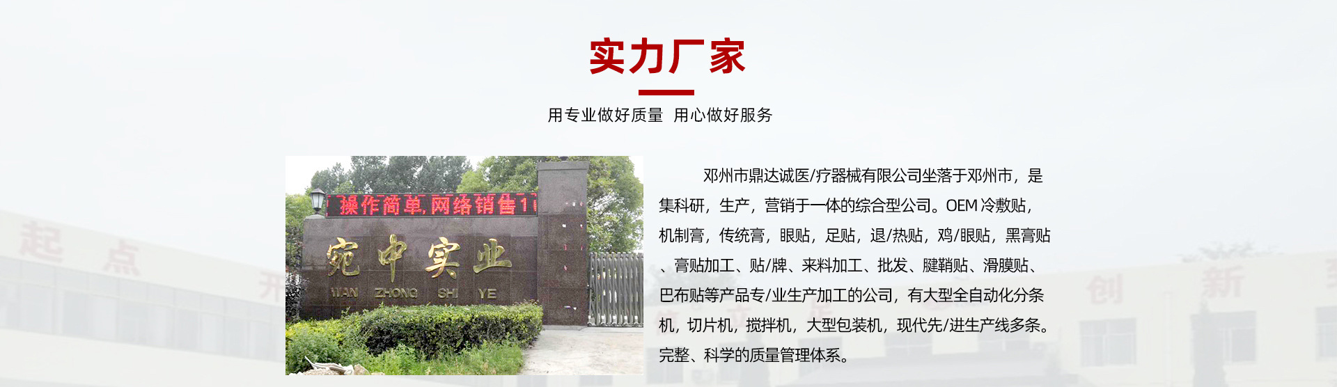 鎮(zhèn)平縣鼎達(dá)誠醫(yī)療器械有限公司坐落于鎮(zhèn)平縣工業(yè)園區(qū),是專業(yè)從事醫(yī)療器械的集科研,生產(chǎn),營銷于一體的綜合型醫(yī)藥公司。OEM 醫(yī)用冷敷貼,機(jī)制膏藥,傳統(tǒng)膏藥,眼貼,足貼,退熱貼,雞眼貼,手工膏藥貼 乳膏。黑膏藥、膏藥加工、膏藥貼牌、來料加工、膏藥批發(fā)、腱鞘貼、滑膜貼、脈管炎貼、減肥貼、止痛貼,巴布貼等產(chǎn)品專業(yè)生產(chǎn)加工的公司,擁有大型全自動(dòng)化分條機(jī),切片機(jī),攪拌機(jī),大型包裝機(jī),現(xiàn)代先進(jìn)生產(chǎn)線多條。完整、科學(xué)的質(zhì)量管理體系。鄧州市鼎達(dá)誠醫(yī)療器械有限公司的誠信、實(shí)力和產(chǎn)品質(zhì)量獲得業(yè)界的認(rèn)可。歡迎各界朋友蒞臨參觀、指導(dǎo)和業(yè)務(wù)洽談。 我們堅(jiān)持,以人為本,公平競爭,的現(xiàn)代企業(yè)制度,不斷加強(qiáng)內(nèi)部資源的整合,管理,充分運(yùn)用資本運(yùn)營,不斷提高企業(yè)的創(chuàng)新能力,為社會(huì)提供最優(yōu)良的產(chǎn)品。真誠歡迎國內(nèi)外有識之士來公司實(shí)地考察,在資金,技術(shù),設(shè)備,銷售等方面進(jìn)行合作,互惠互利,實(shí)現(xiàn)雙贏