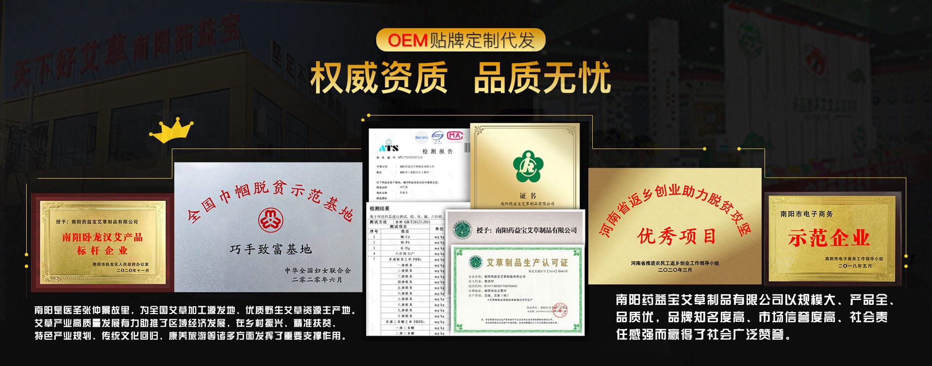 南陽藥益寶艾草制品有限公司成立于2011年初,由臥龍區政協委員、臥龍區科技拔尖人才、返鄉創業精英查洪付帶領團隊注資200萬元創建。坐落在南陽市特色小鎮達士營村艾草·淘寶街,占地20畝。持續投資1.3億元,建有艾絨機械設備研發中心、布藝艾絨技術研發中心、生物科技研發中心,擁有標準化卷條生產車間三層1.5萬㎡,其中艾絨自動提取生產線3條16組,全自動卷條生產線8條,半自動卷條車間1個卷條機器150臺套,無煙艾條加工車間2個,艾草泡腳包車間1個,全自動布藝艾制品車間1個,艾柱切割生產線3條、包裝生產線2條。現已發展成為河南省首家集艾制品生產研制、艾絨機械設備制造、布藝艾絨產品開發、艾草超臨界精油萃取分裝、高端艾草洗化產品研發、艾灸體驗等為一體的全產業鏈特色民營實體企業。常年倉儲三年陳艾2萬噸,年生產各類艾制品12萬箱,年加工原材料6000余噸,2019年實現產值8000余萬元。