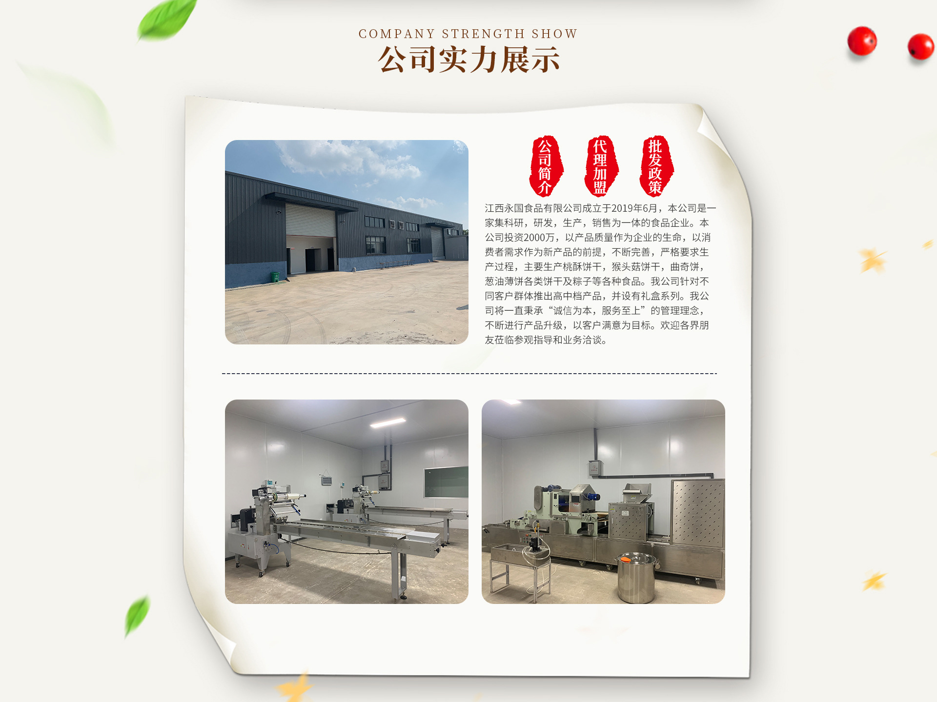 江西永國食品有限公司成立于2019年6月,本公司是一家集科研,研發,生產,銷售為一體的食品企業。本公司投資2000萬,以產品質量作為企業的生命,以消費者需求作為新產品的前提,不斷完善,嚴格要求生產過程,主要生產桃酥餅干,猴頭菇餅干,曲奇餅,蔥油薄餅各類餅干及粽子等各種食品。我公司針對不同客戶群體推出高中檔產品,并設有特色禮盒系列。我公司將一直秉承“誠信為本,服務至上”的管理理念,不斷進行產品升級,以客戶滿意為目標。歡迎各界朋友蒞臨參觀指導和業務洽談。