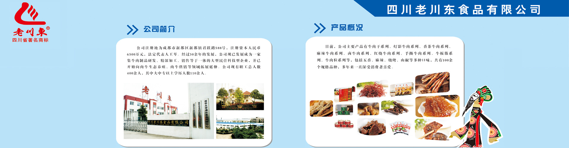 四川老川東食品有限公司注冊地址為中國四川省成都市新都區新都鎮君躍路588號,經營范圍為生產、銷 售:肉制品(醬鹵肉制品)、罐頭(禽畜水產罐頭)、豆制品(非發酵性豆制品)(以上項目憑有效許可 證經營);電腦軟件開發;貨物進出口、技術進出口(法律、行政法規禁止的項目除外,法律、行政法限 制的項目取得許可后方可經營) 。