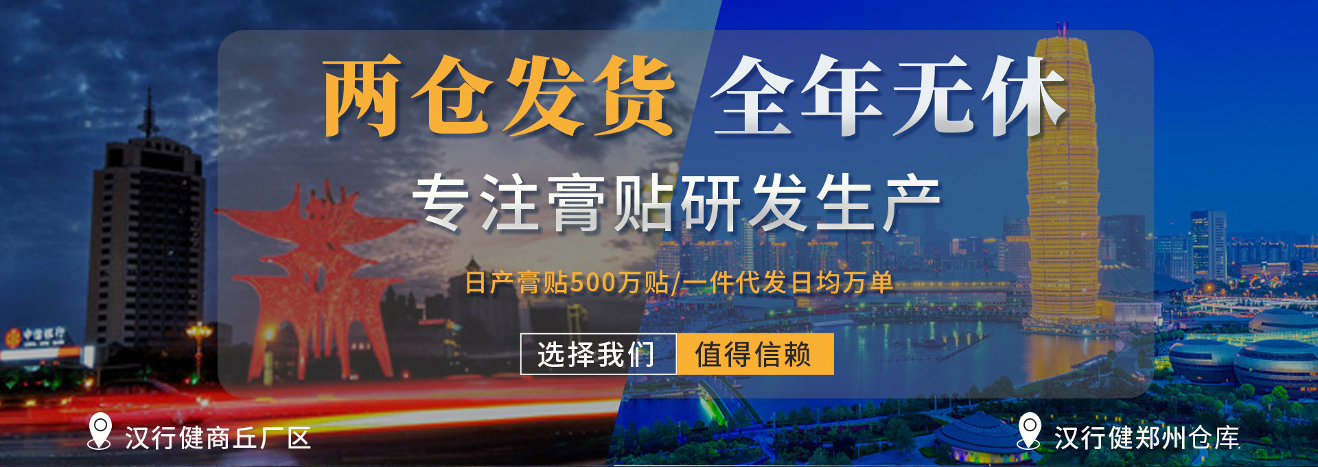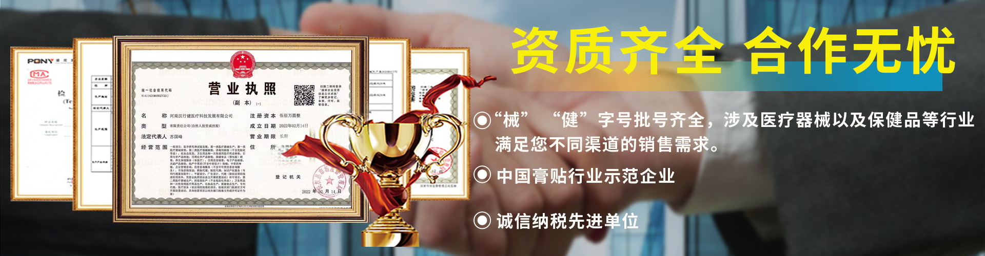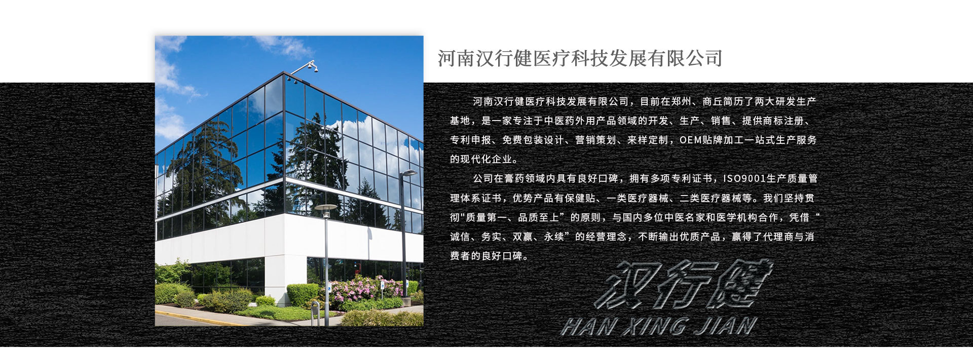 河南漢行健醫療科技發展有限公司是膏藥貼等產品專業生產加工的公司,擁有完整、科學的質量管理體系,專注于中醫藥外用產品領域的開發、生產、銷售!提供商標注冊、專利申報、免費包裝設計、營銷策劃、來樣定制,OEM貼牌加工一站式生產服務。河南漢行健醫療科技發展有限公司的誠信、實力和產品質量獲得業界的認可。歡迎各界朋友蒞臨參觀、指導和業務洽談。