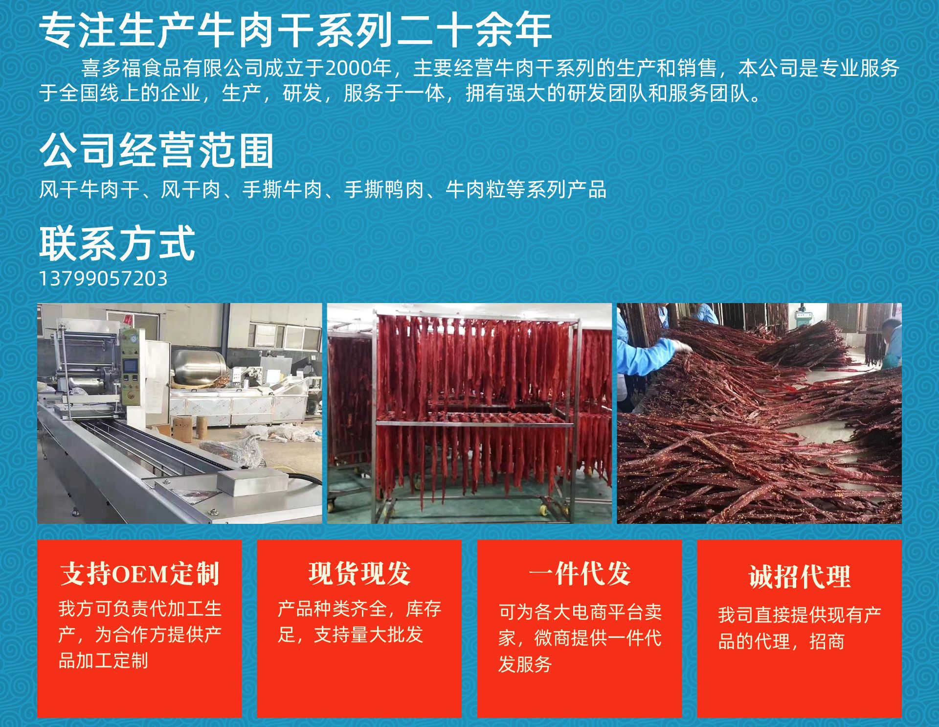 漳州喜多福食品有限責任公司 位于福建 漳州市,主營 :風干牛肉、風干豬肉、鴨肉干巴、牛肉粒、手撕鴨肉、腱子肉 等。公司秉承“顧客至上,銳意進取”的經(jīng)營理念,堅持“客戶”的原則為廣大客戶提供優(yōu)質的服務。歡迎惠顧! 公司成立以來發(fā)展迅速,業(yè)務不斷發(fā)展壯大,我公司與多家漳州零售商和代理商建立了長期穩(wěn)定的合作關系,品種齊全、價格合理,企業(yè)實力雄厚,重信用、守合同、保證產品質量,以多品種經(jīng)營特色和薄利多銷的原則,贏得了廣大客戶的信任,公司始終奉行“誠信求實、致力服務、唯求滿意”的企業(yè)宗旨,全力跟隨客戶需求,不斷進行產品創(chuàng)新和服務改進。