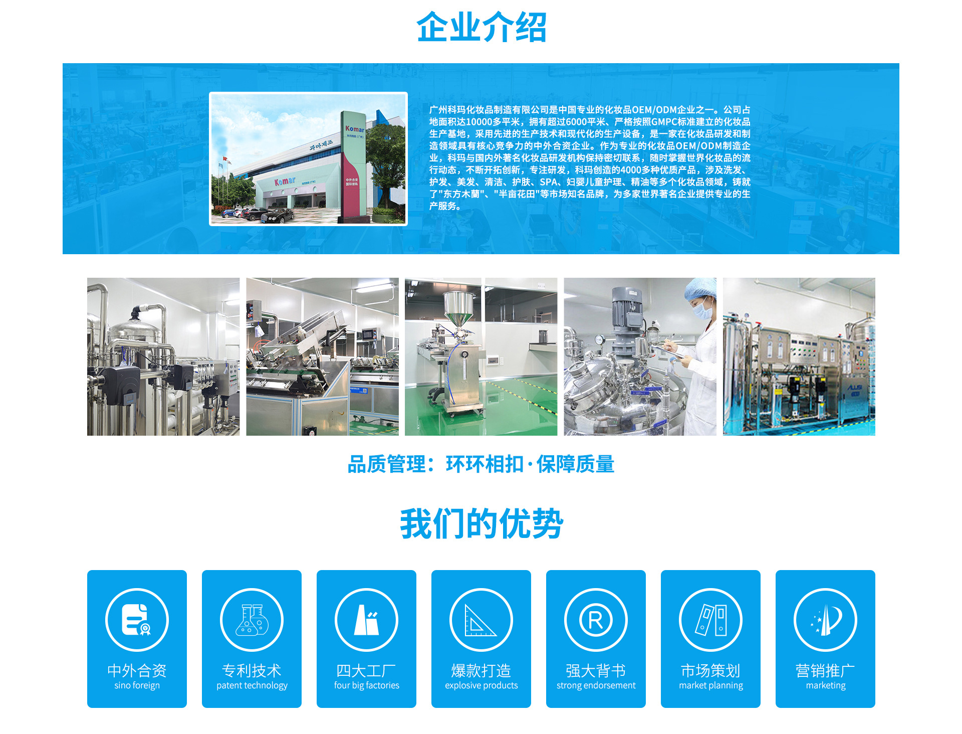 廣州科瑪化妝品制造有限公司創立于2004年,是當時為數不多的化妝品中外合資企業。她隸屬于廣州寶生堂化妝品集團公司,是寶生堂集團公司旗下四個化妝品企業之一,是集團公司外貿制造加工與出口的窗口,從創建初始,各項指標就是與國際接軌,從硬件設施到軟件管理都是按國際高標準嚴格要求,是化妝品行業較早通過歐盟GMPC認證的企業之一,生產品質優良,業務繁忙,在外貿制造加工與出口領域成為國家的知名創匯企業,多次榮獲國內外化妝品OEM代加工類大獎,受到國內外客戶的贊譽。