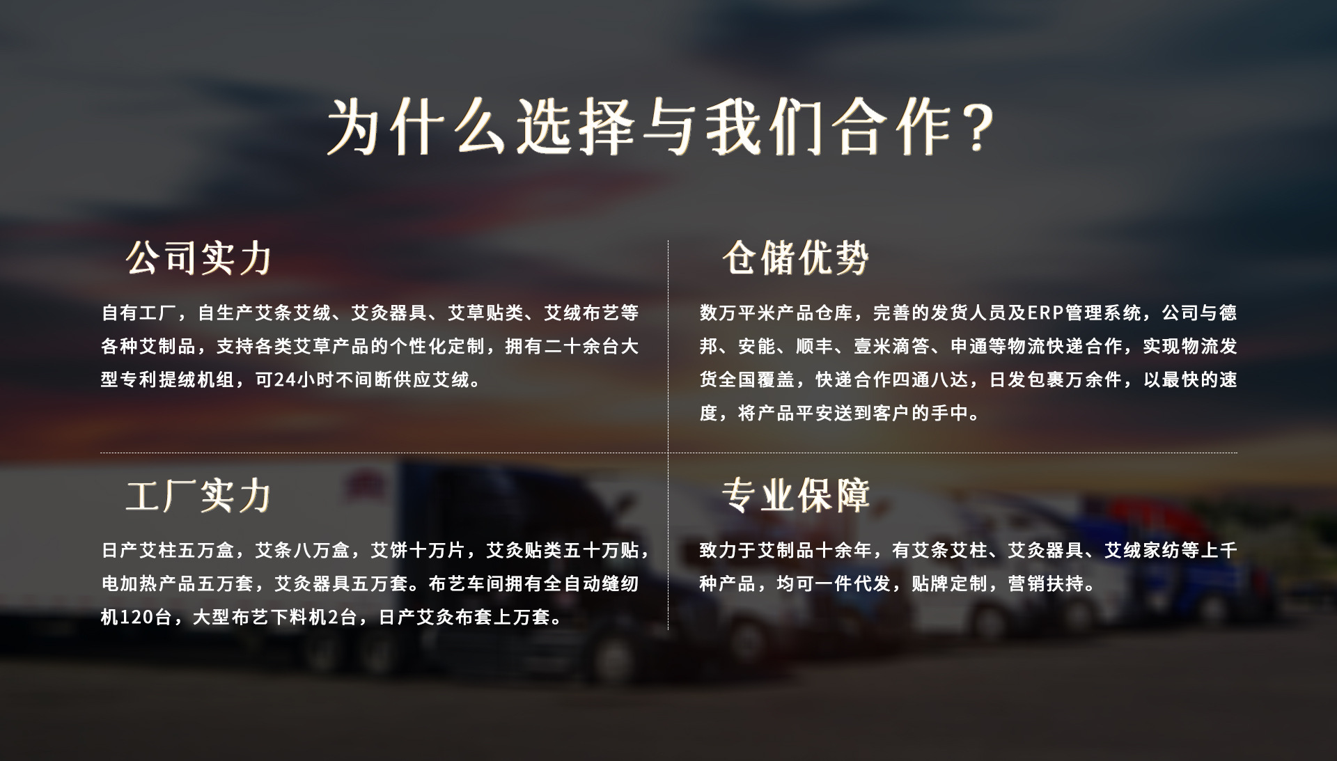 河南科艾健康管理有限公司立足于中國最大的艾制品源頭產地--南陽,在省會鄭州設有運營中心,主要生產艾條艾柱、艾灸器具、電加熱產品、各種貼類、足浴日用等各種艾制品,擁有二十余臺大型專利提絨機組,可24小時不間斷供應艾絨。主廠區廠房面積超過三萬余平米,年艾草存儲量達三萬噸,艾制品生產車間擁有熟練工人400名,配備半自動卷條機120臺,全自動卷條機17臺,全自動切條機8臺,全自動塑封機5臺以及艾餅壓制機等各類先進設備近400臺,可日產艾柱五萬盒,艾條八萬盒,艾餅十萬片,艾灸貼類五十萬貼,電加熱產品五萬套,艾灸器具五萬套。布藝車間擁有全自動縫紉機120臺,大型布藝下料機2臺,日產艾灸布套上萬套,支持各類艾絨家紡產品的個性化定制。 公司擁有專業設計師10余人,平均3年以上的產品研發設計經驗,多位資深設計師有北上廣等地的大型公司工作經驗。