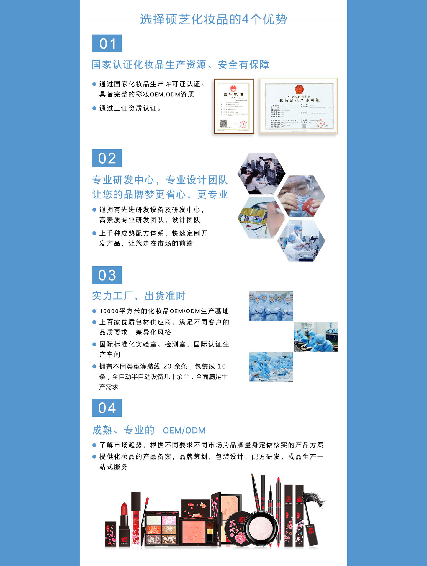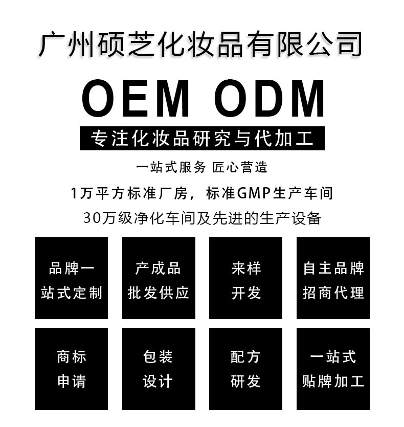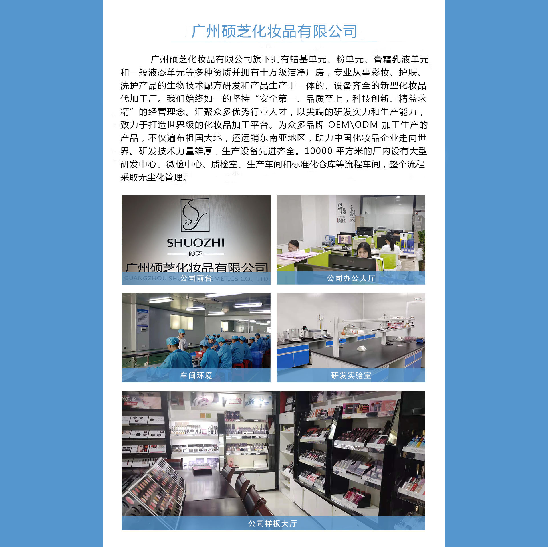 廣州碩芝化妝品有限公司是化妝品OEM/ODM、護膚彩妝等產品專業生產加工的公司,擁有完整、科學的質量管理體系。廣州碩芝化妝品有限公司的誠信、實力和產品質量獲得業界的認可。歡迎各界朋友蒞臨參觀、指導和業務洽談。