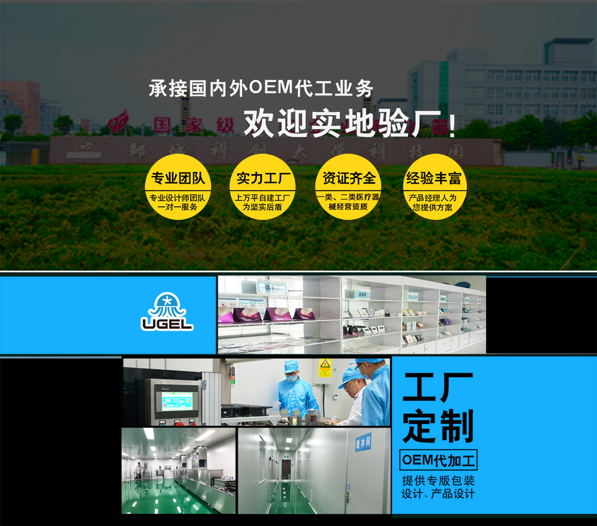 山東優(yōu)杰生物科技有限公司成立于2017年3月,專注于水凝膠創(chuàng)新產(chǎn)品的研發(fā)與生產(chǎn),目前已成為集研發(fā)、生產(chǎn)、銷售、進出口為一體的企業(yè),并致力于成為中國水凝膠產(chǎn)業(yè)的創(chuàng)新者與引領(lǐng)者。公司總面積10000㎡,擁有10萬級、30萬級潔凈廠房,具有醫(yī)療器械、化妝品、消毒產(chǎn)品、日用品等生產(chǎn)資質(zhì),專業(yè)生產(chǎn)水凝膠系列醫(yī)用貼劑、化妝品、醫(yī)美產(chǎn)品、日用品等,擁有12條自動生產(chǎn)線,日生產(chǎn)能力達40萬片(凝膠貼膜)+40萬瓶(凝膠)。 公司定位為“水凝膠創(chuàng)新產(chǎn)品專家”,由業(yè)內(nèi)知名專家?guī)ьI(lǐng)的研發(fā)團隊,擁有多項核心專利,并與山東中醫(yī)藥大學(xué)合作共建中藥凝膠貼劑產(chǎn)學(xué)研基地,與山東生命科技研究院共建創(chuàng)傷修復(fù)技術(shù)平臺,與瑞士LONZA合作凝膠身體貼膜聯(lián)合實驗室,與上海冠英生物共建水凝膠中試基地。