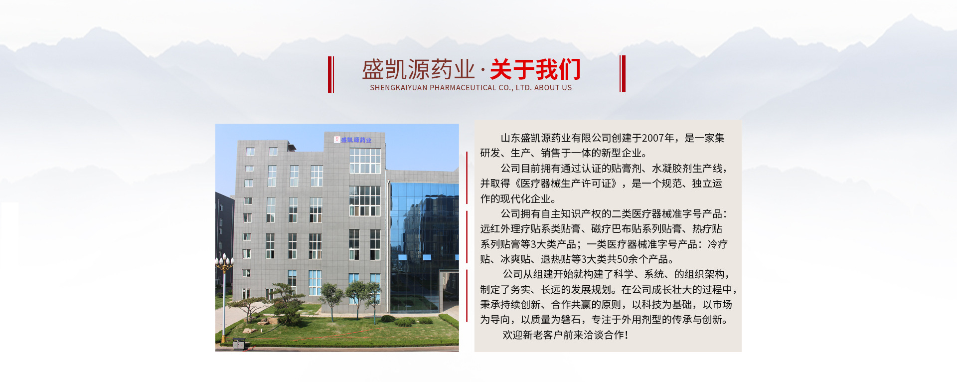 山東盛凱源藥業有限公司創建于2007年,是一家集研發、生產、銷售于一體的新型企業,公司位于中國著名的泉城---濟南。 公司目前擁有通過認證的貼膏劑、凝膠劑、噴霧劑、洗劑生產線4條,并取得《醫療器械生產許可證》、《衛生許可證》,是一個完備、規范、獨立運作的現代化企業。 公司擁有自主知識產權的遠紅外理療貼、磁療巴布貼、熱療貼、高分子水凝膠貼劑、黑膏藥、凝膠劑、噴霧劑、洗劑等8大類50余個產品。