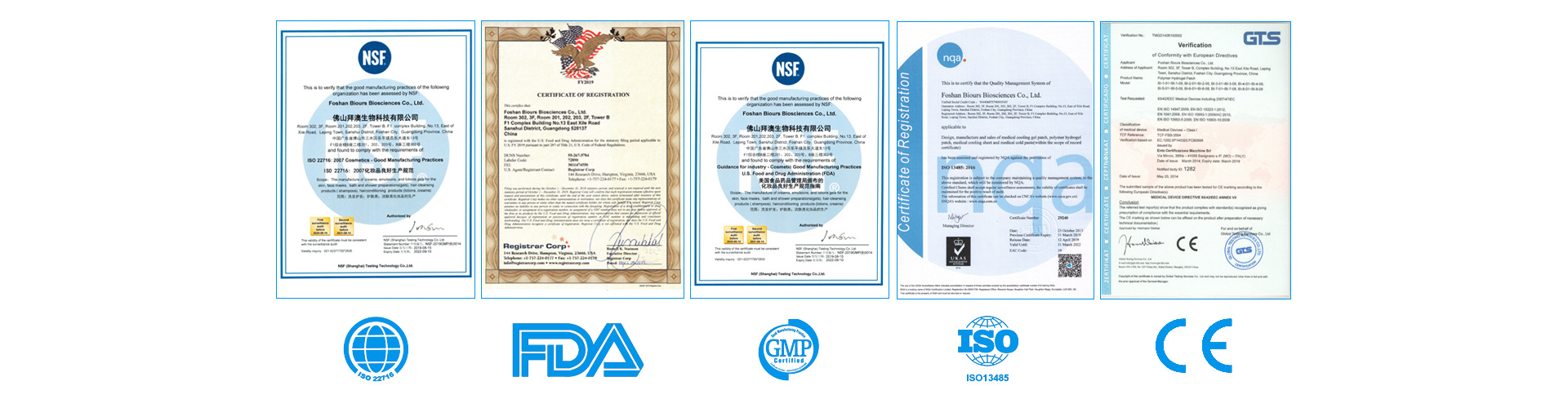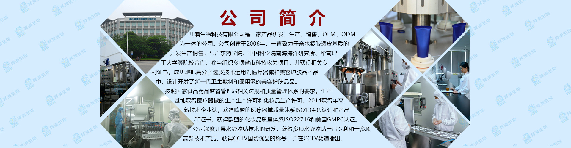 我司專業從事研究和生產水凝膠美容貼類產品和醫療器械產品已有10多年經驗。旗下工廠:佛山拜澳生物科技有限公司,配備10萬級凈化車間,先進的生產設備和自動包裝設備,按ISO13485:2003,ISO22716:2007體系生產操作,而我們的產品亦通過CE/ GMPC/ MSDS認證。 我司擁有自有6項專利技術,發展美容品和個人護理品,以廣東省和廣州市科技公關項目的技術為基礎,成功地在醫藥衛生領域和日用化妝品領域進行了開發和應用,為國內外眾多的知名品牌研發及生產了數十種高技術產品,國家項目“甘納”透皮劑的研究也取得階段性成果,目前正進行臨床前工作。 我司擁有海水之露、ICEGEL、七葉草等品牌產品。 支持OEM/ ODM加工,專業提供包括配方成分服務,可按要求定制形狀,定制包裝標識等。