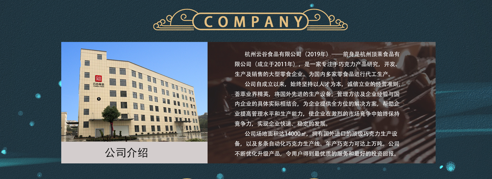 杭州云谷食品有限公司(2019年)——前身是杭州頂萊食品有限公司(成立于2011年),是一家專注于巧克力產(chǎn)品研究,開發(fā)、生產(chǎn)及銷售的大型零食企業(yè)。為國內(nèi)多家零食品進(jìn)行代工生產(chǎn)。 公司自成立以來,始終堅持以人才為本,誠信立業(yè)的經(jīng)營準(zhǔn)則,薈萃業(yè)界精英,將國外先進(jìn)的生產(chǎn)設(shè)備,管理方法及企業(yè)經(jīng)驗與國內(nèi)企業(yè)的具體實際相結(jié)合,為企業(yè)提供全方位的解決方案,幫助企業(yè)提高管理水平和生產(chǎn)能力,使企業(yè)在激烈的市場競爭中始終保持競爭力,實現(xiàn)企業(yè)快速、穩(wěn)定的發(fā)展。 公司場地面積達(dá)14000㎡,擁有國外進(jìn)口的頂級巧克力生產(chǎn)設(shè)備,以及多條自動化巧克力生產(chǎn)線。年產(chǎn)巧克力可達(dá)上萬噸。公司不斷優(yōu)化升級產(chǎn)品,令用戶得到最優(yōu)質(zhì)的服務(wù)和最好的投資回報。 好的產(chǎn)品、好的服務(wù)、好的信譽(yù),杭州云谷食品有限公司已經(jīng)在諸多領(lǐng)域取得輝煌成績,完成眾多配套服務(wù),也愿意成為您最可信賴的長期合作伙伴!