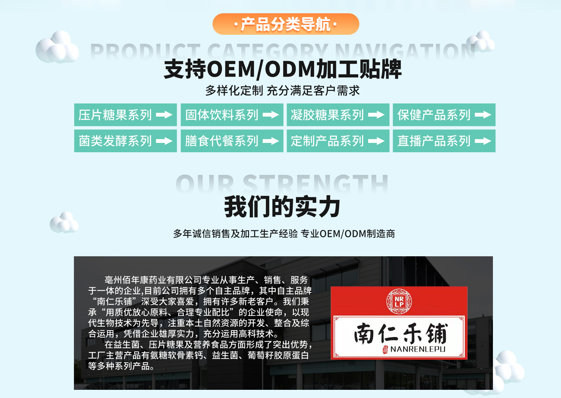 亳州佰年康藥業有限公司專業從事生產、銷售、服務于一體的企業,目前公司擁有多個自主品牌,其中自主品牌“南仁樂鋪”深受大家喜愛,擁有許多新老客戶。我們秉承“用質優放心原料、合理專業配比”的企業使命,以現代生物技術為先導,注重本土自然資源的開發、整合及綜合運用,憑借企業雄厚實力,充分運用高科技術。 在益生菌、壓片糖果及營養食品方面形成了突出優勢,工廠主營產品有氨糖軟骨素鈣、益生菌、葡萄籽膠原蛋白等多種系列產品。