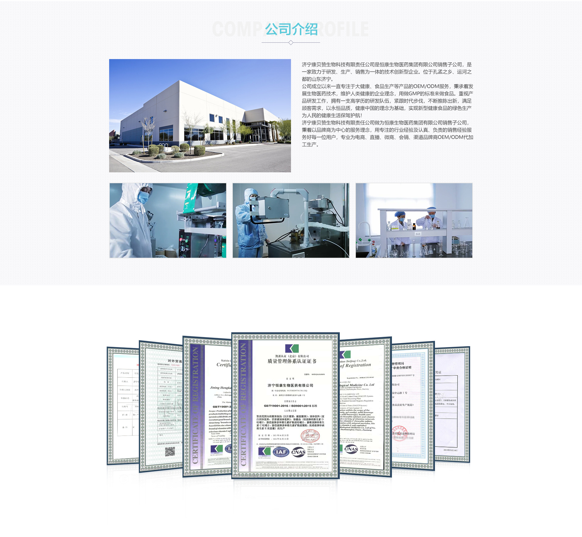 濟(jì)寧康貝贊生物科技有限公司是恒康生物醫(yī)藥集團(tuán)有限公司銷售子公司,是一家致力于研發(fā)、生產(chǎn)、銷售為一體的技術(shù)創(chuàng)新型企業(yè)。位于孔孟之鄉(xiāng)、運(yùn)河之都的山東濟(jì)寧。 公司成立以來一直專注于大健康、食品生產(chǎn)等產(chǎn)品的OEM/ODM服務(wù),秉承著發(fā)展生物醫(yī)藥技術(shù),走大健康產(chǎn)業(yè)發(fā)展的企業(yè)理念。重視產(chǎn)品研發(fā)工作,擁有一支高學(xué)歷的研發(fā)隊(duì)伍,緊跟時(shí)代步伐,不斷推陳出新,滿足顧客需求,以永恒品質(zhì),健康中國的理念為基礎(chǔ),實(shí)現(xiàn)新型健康食品的綠色生產(chǎn),為人民的健康生活保駕護(hù)航!