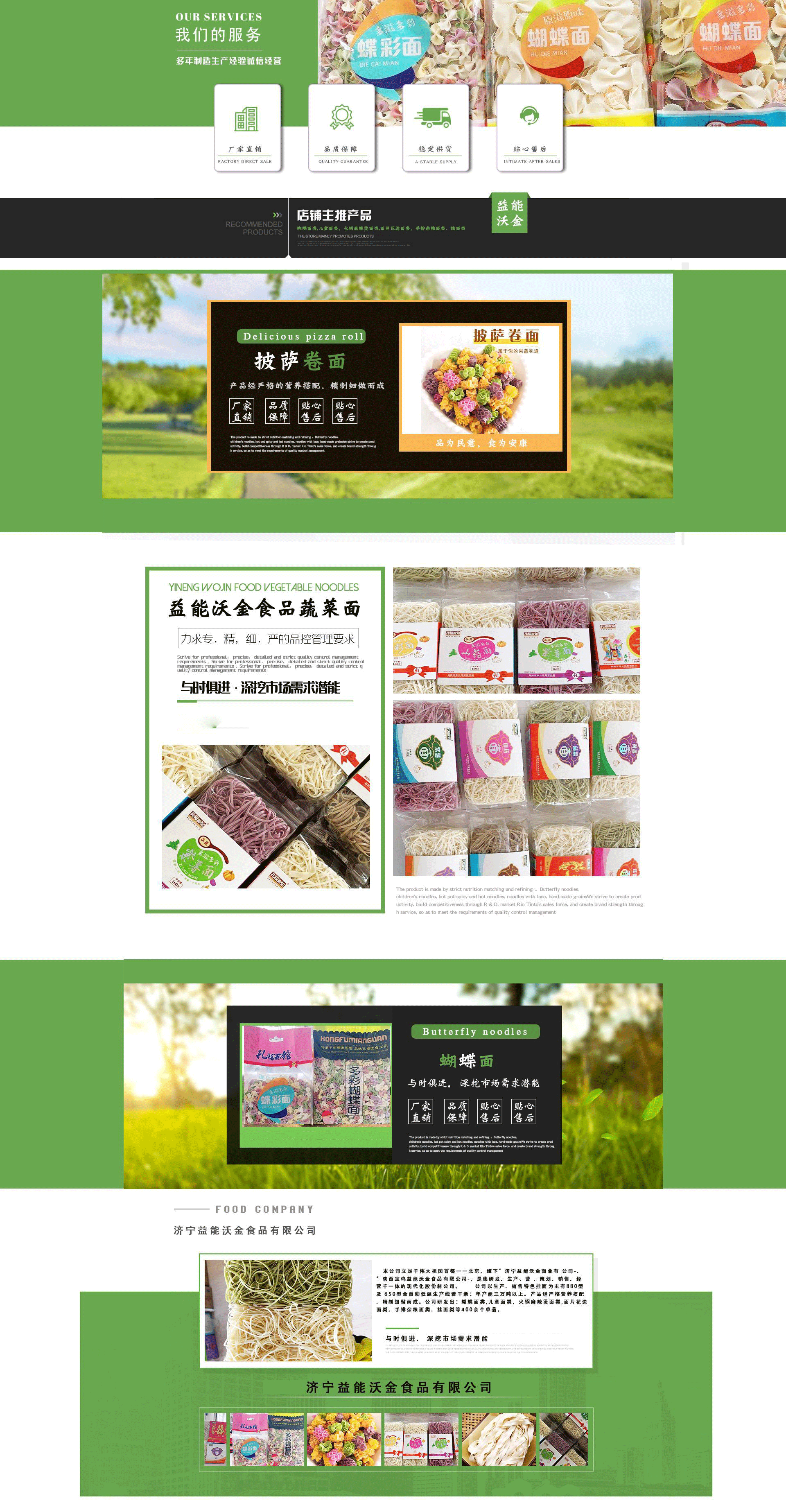 濟寧益能沃金食品有限公司是北京益能沃金食品有限公司旗下子公司。本公司主要生產(chǎn)經(jīng)營果蔬蝴蝶面、火鍋系列燴面、手盤營養(yǎng)面、波紋碗面、兒童面、雜糧蔬菜掛面、花邊刀削面、果蔬寧花面等二百多個系列面制品。本著品為民益食為安康的理念,始終不加色素和非法添加劑堅持做老百姓健康的好面,13年來受到廣大客戶和消費者的一致好評。歡迎廣大客戶來電咨詢訂購!