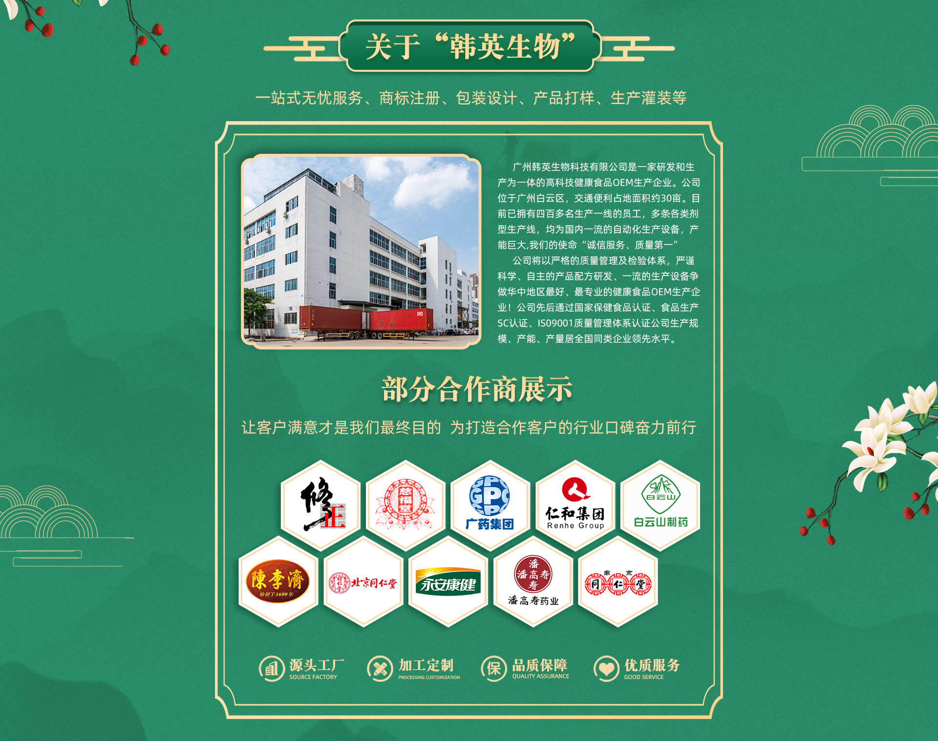 廣州韓英生物科技有限公司是一家綜合性健康食品及生物技術服務企業,主營保健食品、營養食品、新資源食品生產加工OEM、ODM等業務。廣州韓英生物科技有限公司,秉承關愛生命,以人為本的宗旨,致力于全民健康工程,倡導“品質為本,客戶至上”的經營理念;科技領先,追求卓越的企業宗旨,以專業生產、銷售及全程健康服務為一體,打造健康營養保健品。 可生產加工固體飲料、壓片糖果、袋泡茶、果凍、膏滋、口服液、軟糖、代餐餅、口香糖、等產品。公司提供原材料采購、研發生產、標準申報、模具多樣、設計包裝等。
