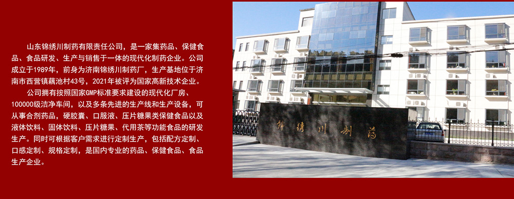 山東錦繡川制藥,是集藥品、保健食品、食品的研發、生產與銷售于一體的現代化制藥企業。是國內首家從事蘆筍藥品研發生產的企業,是國內同時擁有藥品、保健食品、食品真菌發酵生產車間及技術的企業,是國內專業的保健食品、特膳食品生產基地。