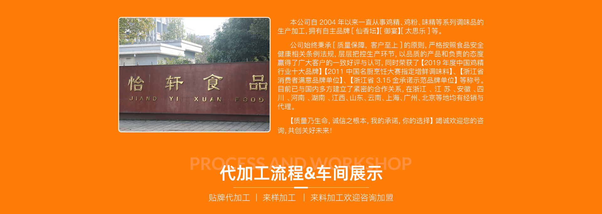 本公司自2004年以來一直從事雞精、雞粉、味精等系列調味品的生產加工,擁有自主品牌[仙香壇] [御宴] [太思樂]等 。 公司始終秉承[質量第一,客戶至上]的原則,嚴格按照食品安全健康相關條例法規,層層把控生產環節,以優質的產品和負責的態度贏得了廣大客戶的一致好評與認可,同時榮獲了【2019年度中國雞精行業十大品牌】【2011中國名廚烹飪大賽指定增鮮調味品】、【浙江省消費者最滿意品牌單位】、【浙江省3.15金承諾示范品牌單位】等稱號。 目前已與國內多方建立了緊密的合作關系,在浙江、江蘇、安徽、四川、河南、湖南、江西、山東、云南、上海、廣州、北京等地均有經銷與代理