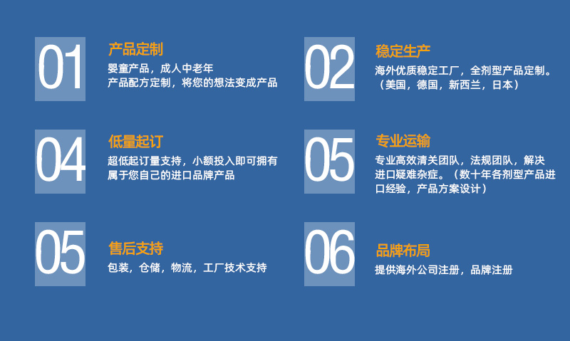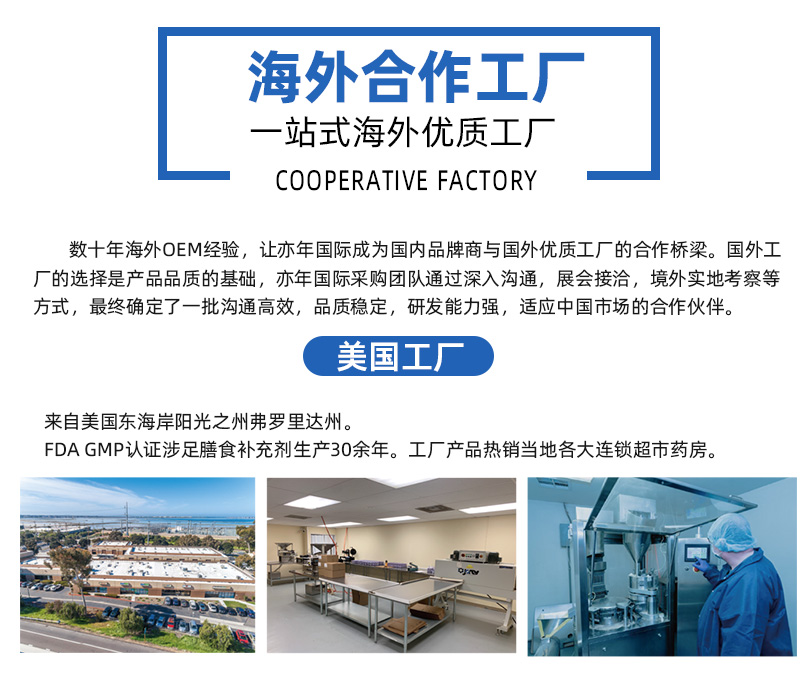 亦年國際與美國,德國,日本,新西蘭等國家的優質工廠達成長期深度合作。從原料選取,配方研發,質量管控,包裝設計,加工成品,高效運輸等各個環節,亦年國際整合全球優質資源,一直用心地為每位品牌商提供合適的、多元化、多品類的產品服務方案與全方位的服務計劃。