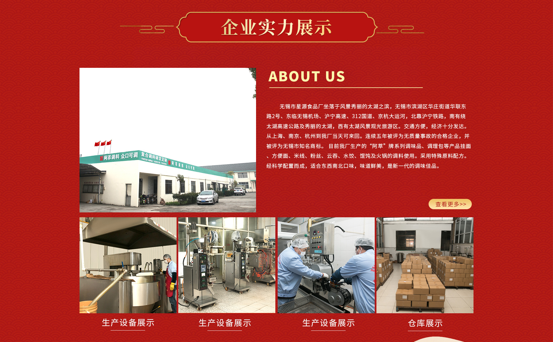 無錫市星源食品廠坐落于風景秀麗的太湖之濱,無錫市濱湖區華莊街道華聯東路2號、東臨無錫機場、滬寧高速、312國道、京杭大運河,北靠滬寧鐵路,南有繞太湖高速公路及秀麗的太湖,西有太湖風景觀光旅游區。交通方便,經濟十分發達。從上海、南京、杭州到我廠當天可來回,連續五年被評為無質量事故的合格企業,并被評為無錫市知名商標。 目前我廠生產的“阿萃”牌系列調味品、調理包等產品永恒掛面、方便面、米線、粉絲、云吞、水餃、餛飩及火鍋的調料使用。采用特殊原料配方。經科學配置而成,適合東西南北口味,味道鮮美,是新一代的調味佳品。