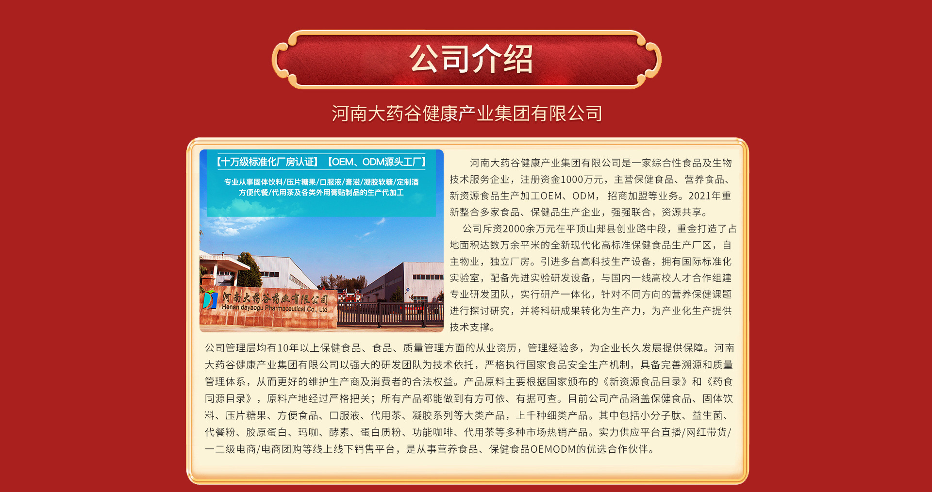 河南大藥谷健康產業集團有限公司是一家綜合性食品及生物技術服務企業,注冊資金1000萬元,主營保健食品、營養食品、新資源食品生產加工OEM、ODM,招商加盟等業務。2021年重新整合多家食品、保健品生產企業,強強聯合,資源共享。 公司斥資2000余萬元在平頂山郟縣創業路中段,重金打造了占地面積達數萬余平米的全新現代化高標準保健食品生產廠區,自主物業,獨立廠房。引進多臺高科技生產設備,擁有國際標準化實驗室,配備先進實驗研發設備,與國內一線高校人才合作組建專業研發團隊,實行研產一體化,針對不同方向的營養保健課題進行探討研究,并將科研成果轉化為生產力,為產業化生產提供技術支撐。實力供應平臺直播/網紅帶貨/-二級電商電商團購等線上線下銷售平臺,是從事營養食品、保健食品OEM. ODM的優選合作伙伴。