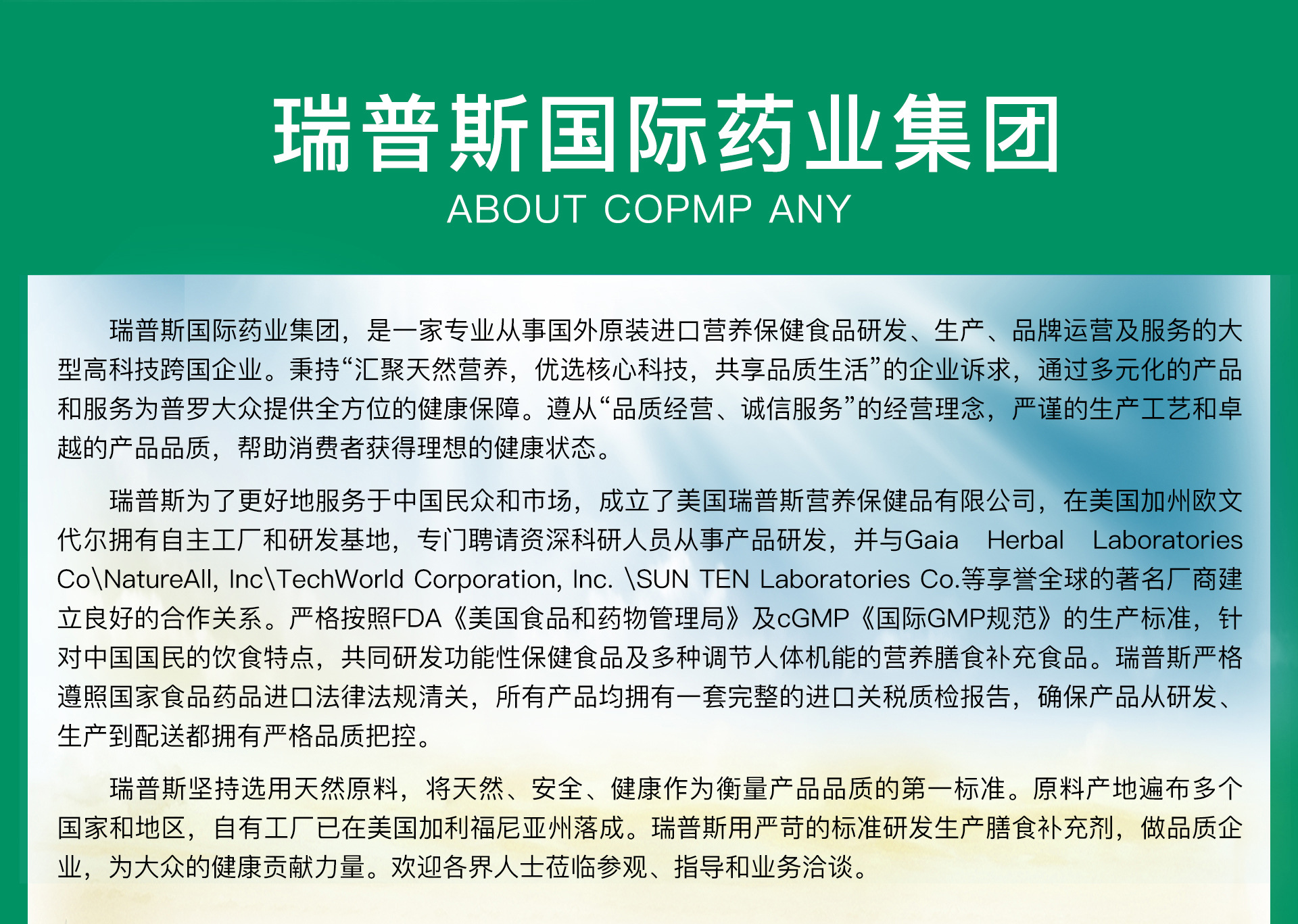 是一家集研發、生產、銷售為一體的大型現代化企業,主營產品為膳食營養補充 劑,主營業務包括OEM/ODM貼牌服務、品牌運營服務等。自創始以來,一直 深耕大健康產業,15年行業經驗積累,始終致力于服務和發展更具有社會價值的 優質品牌,鏈接全球大健康優質資源,為大健康產業提供全球供應鏈解決方案及品牌運營服務。