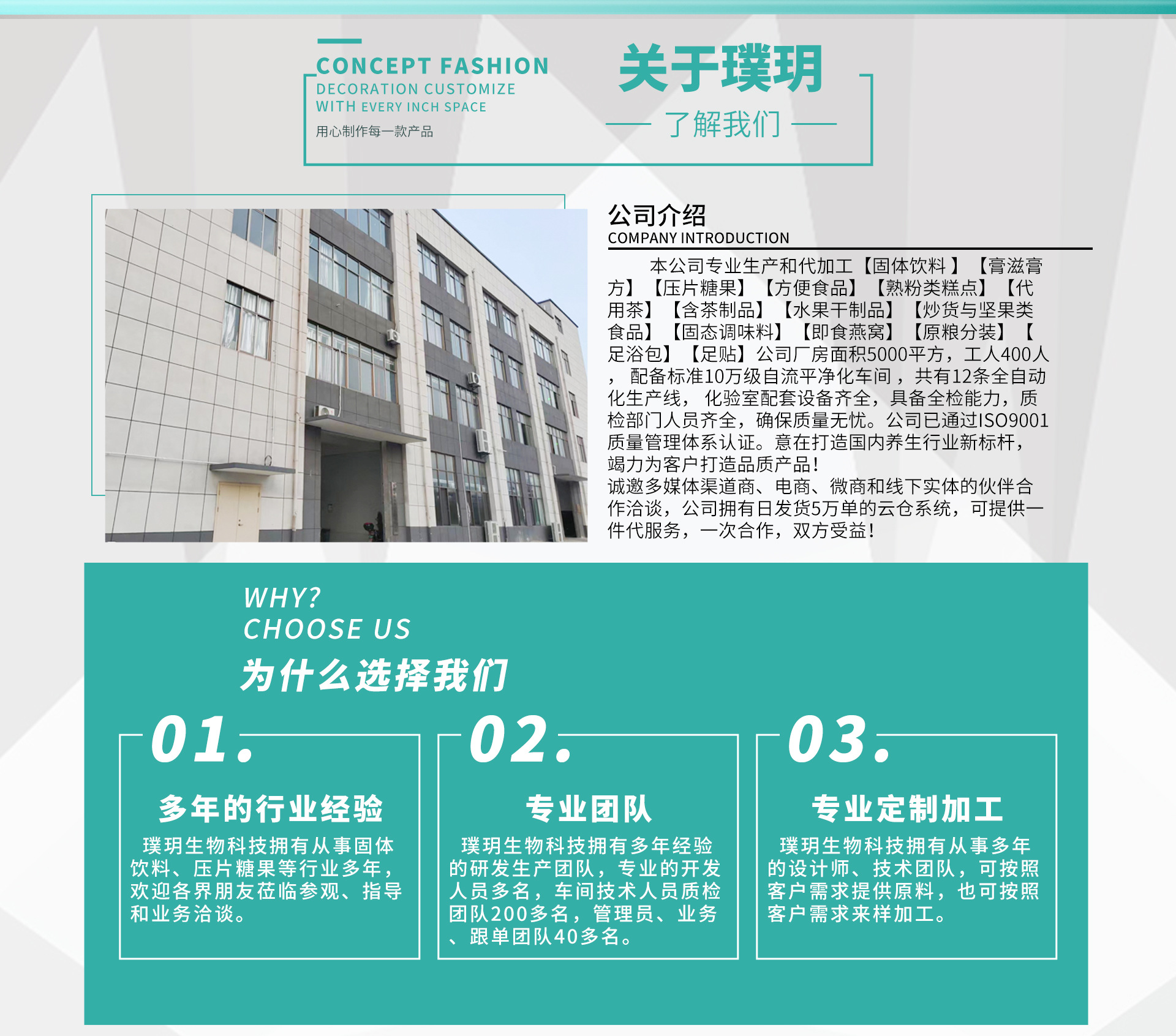 本公司專業(yè)生產(chǎn)和代加工【固體飲料 】【膏滋膏方】【壓片糖果】【方便食品】【熟粉類糕點(diǎn)】【代用茶】【含茶制品】【水果干制品】【炒貨與堅果類食品】【固態(tài)調(diào)味料】【即食燕窩】【原糧分裝】【足浴包】【足貼】公司廠房面積5000平方,工人400人, 配備標(biāo)準(zhǔn)10萬級自流平凈化車間 ,共有12條全自動化生產(chǎn)線, 化驗(yàn)室配套設(shè)備齊全,具備全檢能力,質(zhì)檢部門人員齊全,確保質(zhì)量無憂。公司已通過ISO9001質(zhì)量管理體系認(rèn)證。意在打造全國養(yǎng)生行業(yè)新標(biāo)桿,竭力為客戶打造完美產(chǎn)品! 誠邀多媒體渠道商、電商、微商和線下實(shí)體的伙伴合作洽談,公司擁有日發(fā)貨5萬單的云倉系統(tǒng),可提供一件代服務(wù),一次合作,終身朋友!