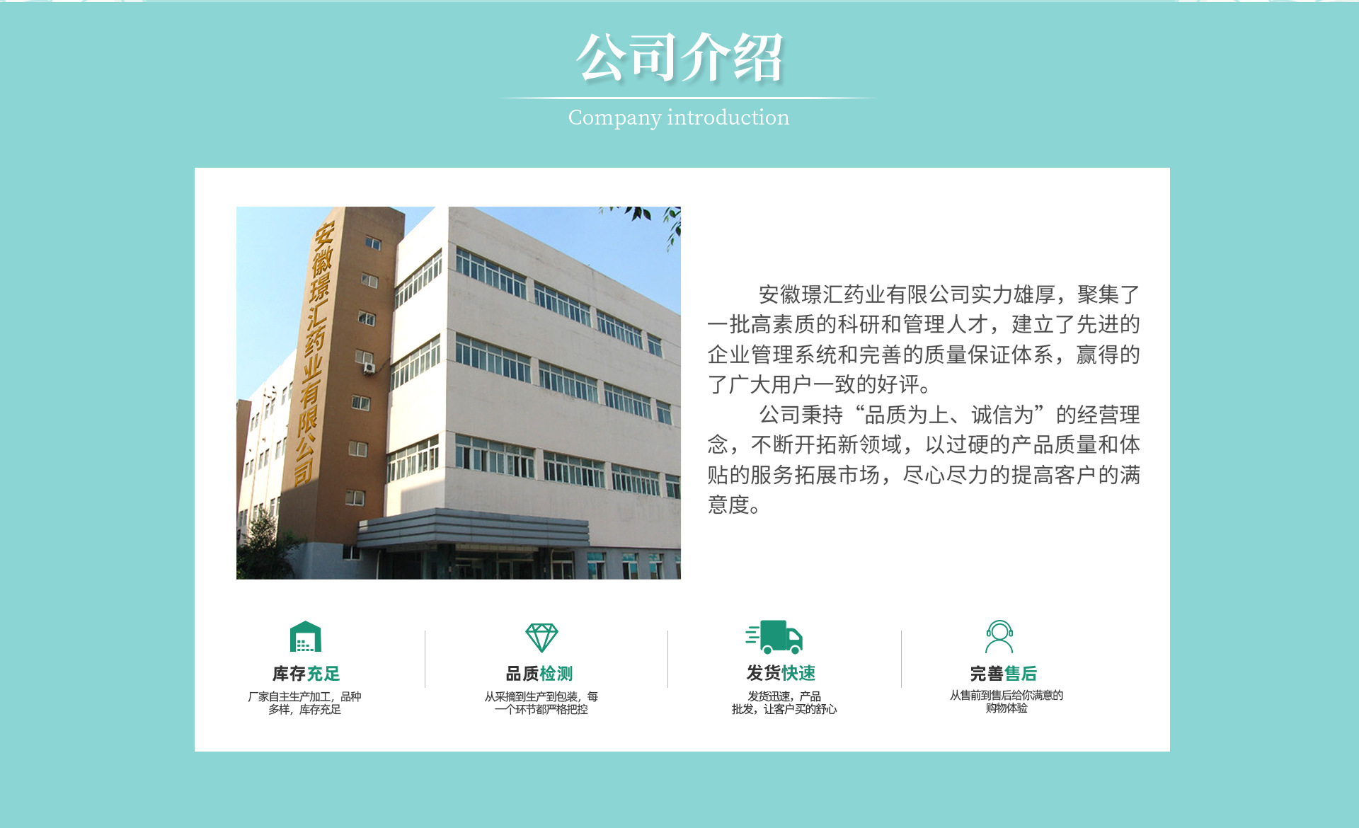 安徽璟匯藥業有限公司實力雄厚,聚集了一批高素質的科研和管理人才,建立了先進的企業管理系統和完善的質量保證體系,贏得的了廣大用戶一致的好評。公司秉持“品質為上、誠信為”的經營理念,不斷開拓新領域,以過硬的產品質量和體貼的服務拓展市場,盡心盡力的提高客戶的滿意度。