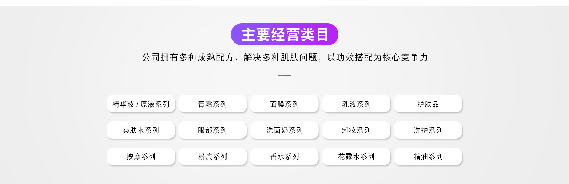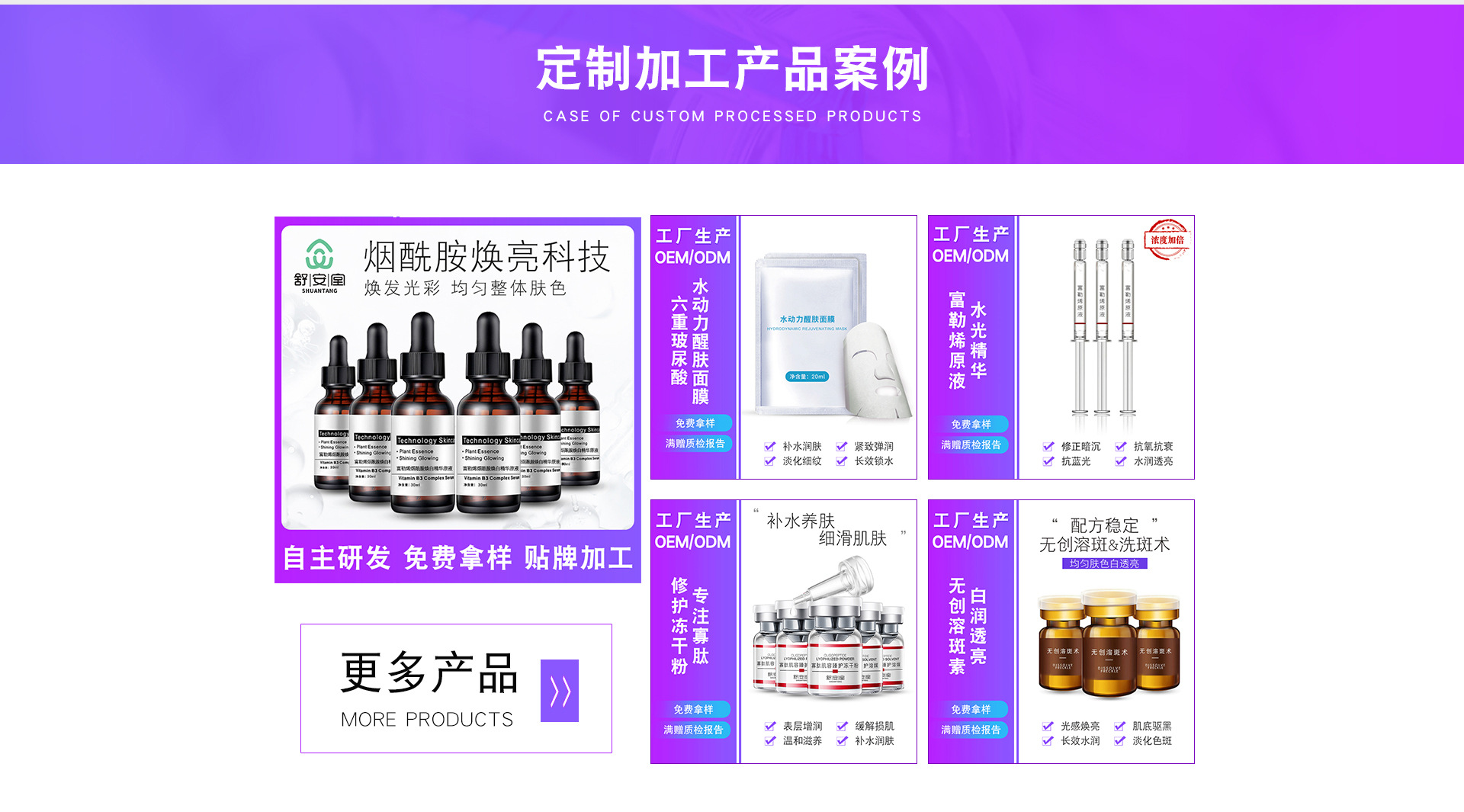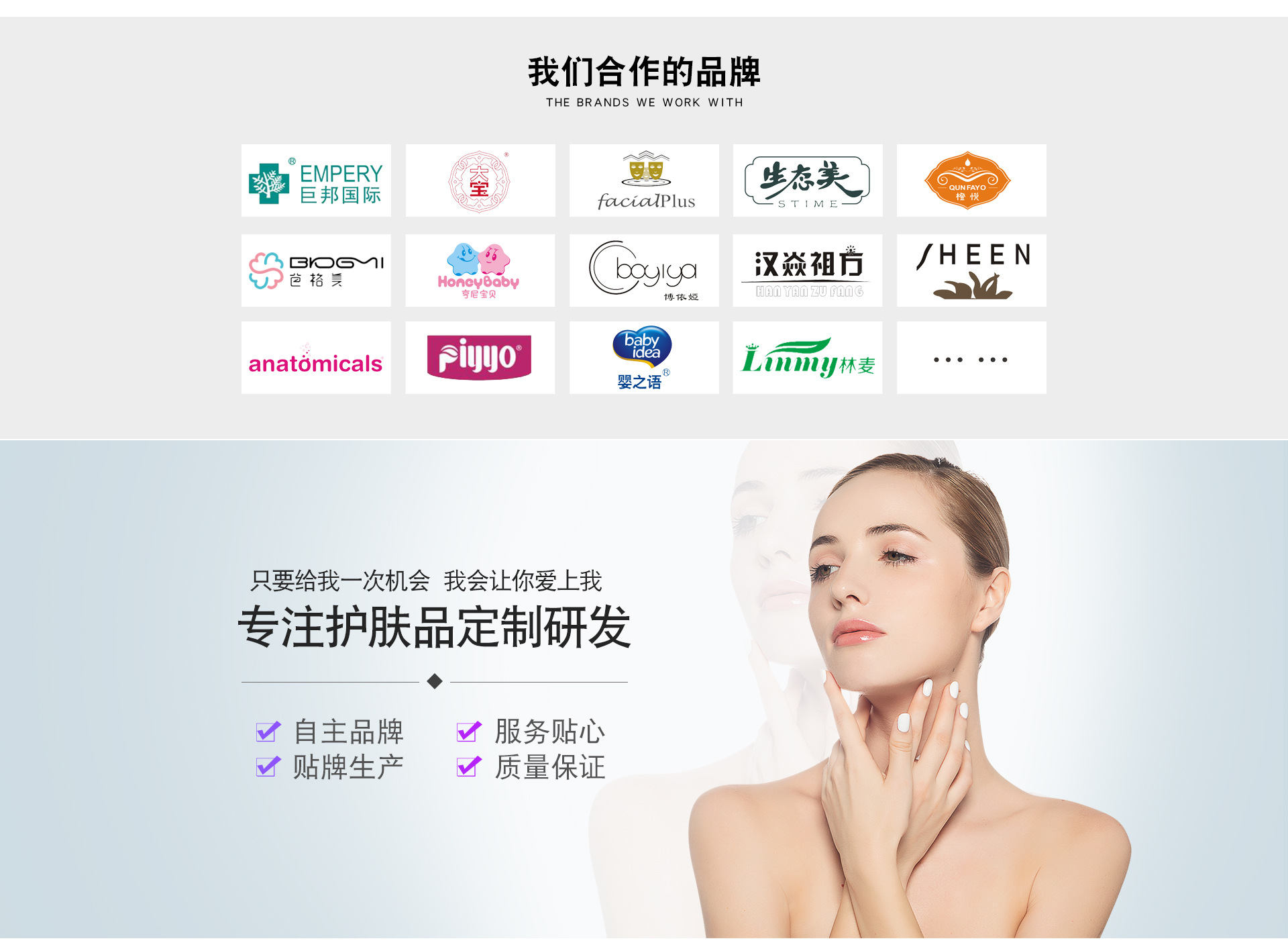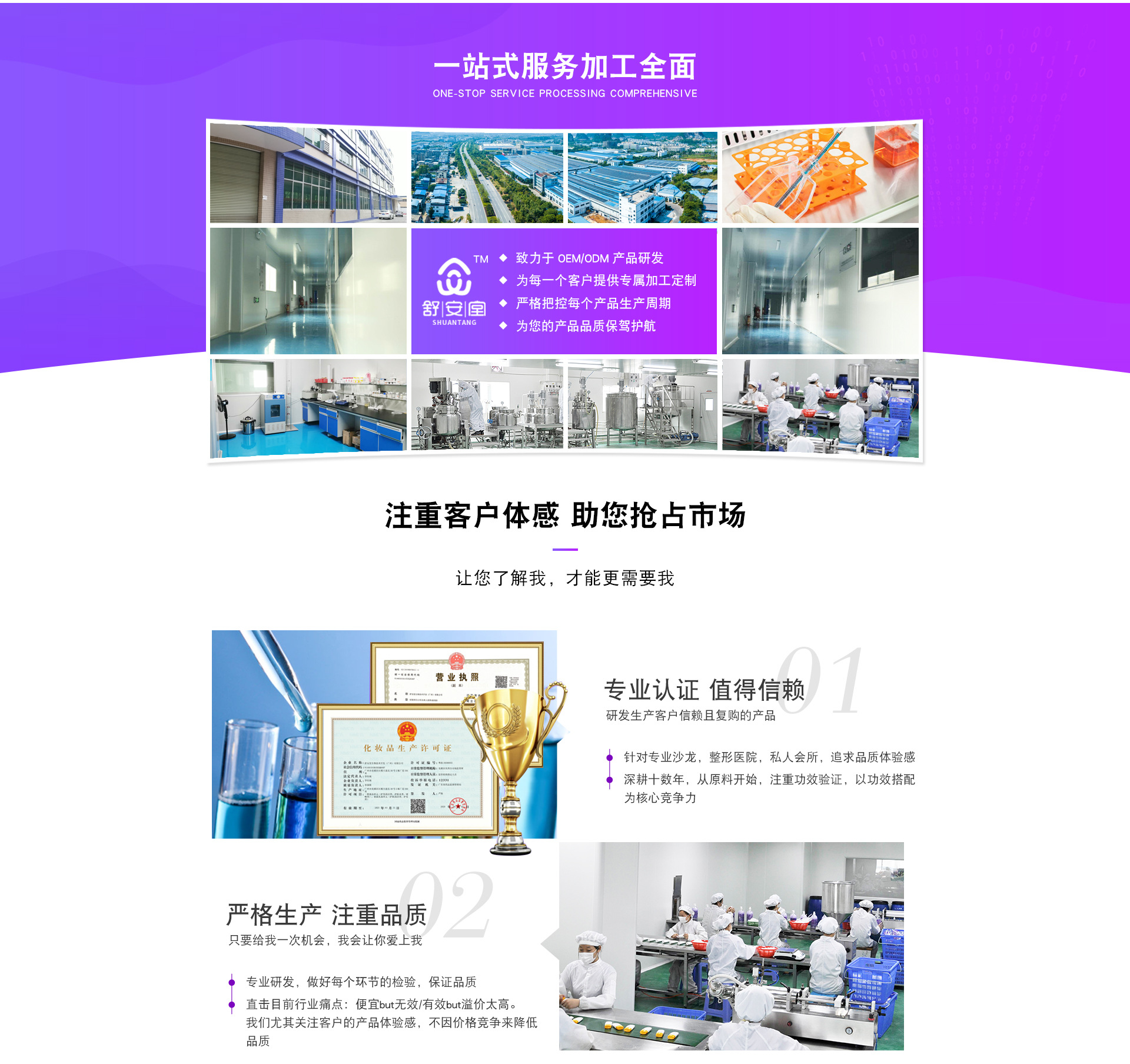 舒安堂生物科技開發(廣州)有限公司是一家以化妝品生產技術的研發為核心、集策劃、生產、銷售為一體的實業公司。專注于中高端化妝品品牌及半成品OEM、OBM、ODM加工,為眾多品牌商、美容連鎖機構、微商電商、開發商提供高效、新穎、獨特、尖端的綠色環保系列產品。公司擁有5000多平方米,十萬級無塵車間,超過8000多種成熟配方,數十人的科研團隊,日生產能力20噸。 公司的主要產品有洗面奶、化妝水、面膜、精華、原液、乳液、膏霜、精油、祛斑產品、減肥產品及隔離防曬、美白遮瑕、手霜、洗發水、沐浴露、養生產品,婦科產品等各系列護膚品加工服務。 舒安堂生物技術開發(廣州)有限公司的誠信、實力和產品質量獲得業界的認可。歡迎各界朋友蒞臨參觀、指導和業務洽談