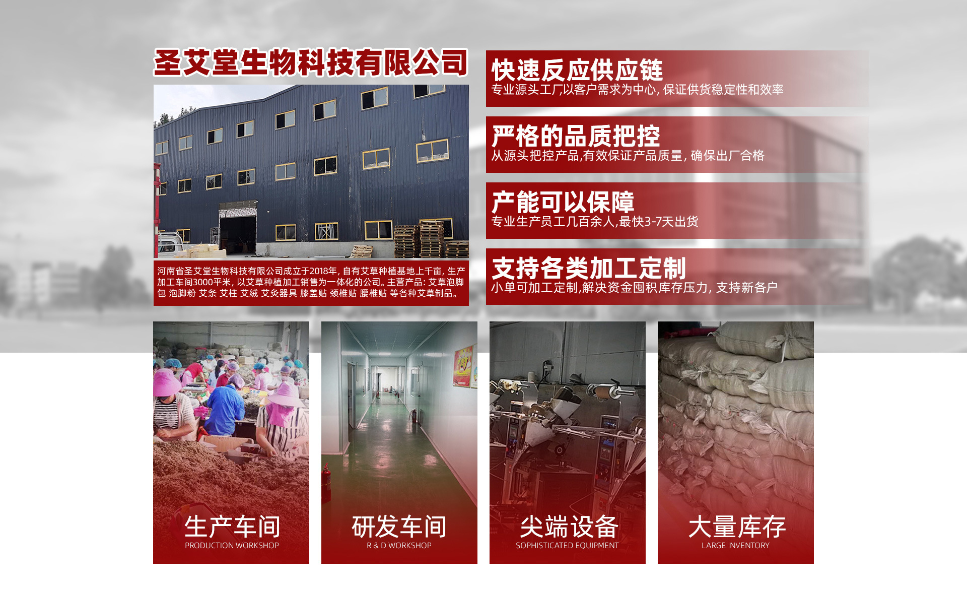 河南省圣艾堂生物科技有限公司成立于2018年,自由艾草種植基地上千畝,生產加工車間3000平米,以艾草種植加工銷售為一體化的公司。主營產品:艾草泡腳包 泡腳粉 艾條 艾柱 艾絨 艾灸器具 膝蓋貼 頸椎貼 腰椎貼 等各種艾草制品