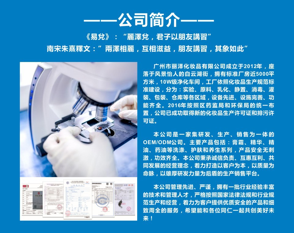廣州麗澤化妝品有限公司是一家專業從事高科技化妝品研發、生產、銷售、服務、及功效性原料供應于一體的OEM、ODM(代加工)綜合性企業。擁有八千平方標準廠房,10W級無塵車間。本公司堅持以誠信經營為原則,著力打造以客戶為本,以質量為命脈,讓顧客滿意的銷售平臺。并以雄厚的技術力量作后盾,不斷的研發各種天然、獨特、安全、高效的高品質半成品,根據市場的各種需求進行靈活性的配方設計,幫您生產個性化產品,助您創造自己的品牌,為您靈活運作市場提供有力的保障。這里就是您的工廠,這里有您的技術研發基地,生產基地,策劃中心,您需要做什么產品,一個電話就可以解決。不論您是批量生產,還是小批量加工,都能在獲得高質量產品的同時,享受到同樣優質、真誠的服務。