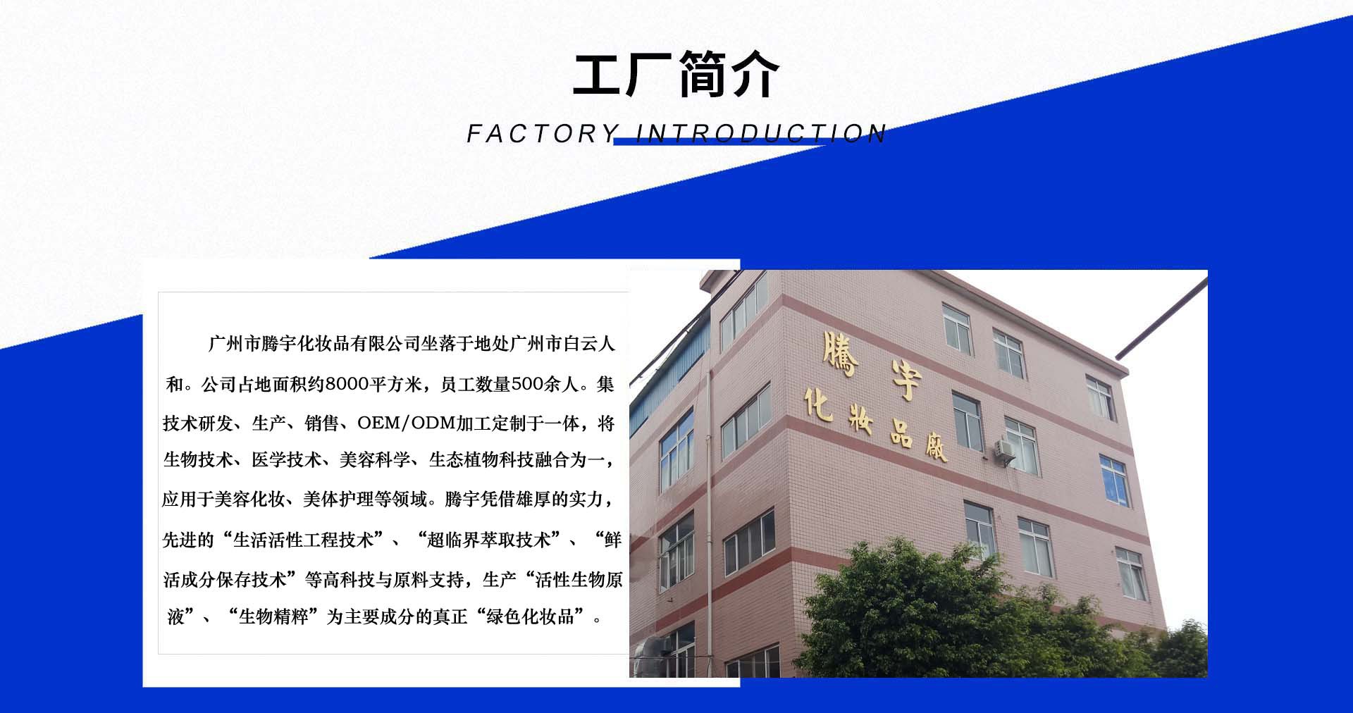 廣州美兮生物科技有限公司隸屬于騰宇集團的第四家大型工廠,騰宇集團歷經了10年的發展已成為一家具有國際化專業水平的化妝品研發、生產商,坐落于廣州花都區,廠區面積近40000㎡