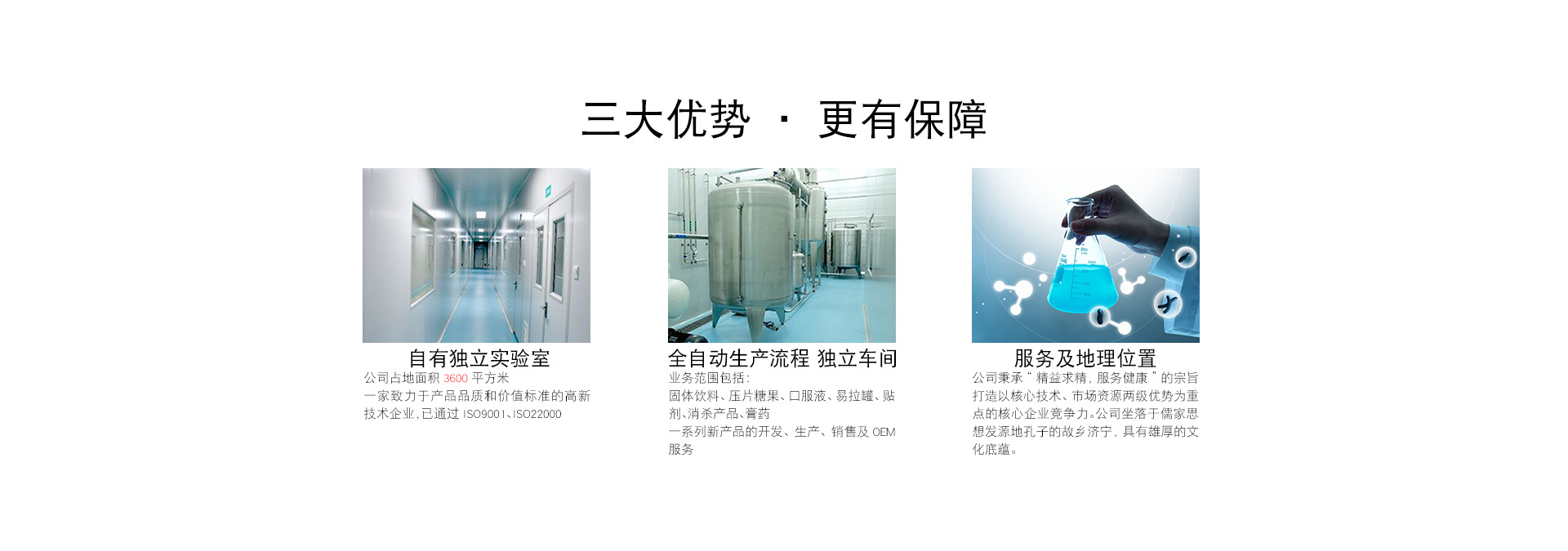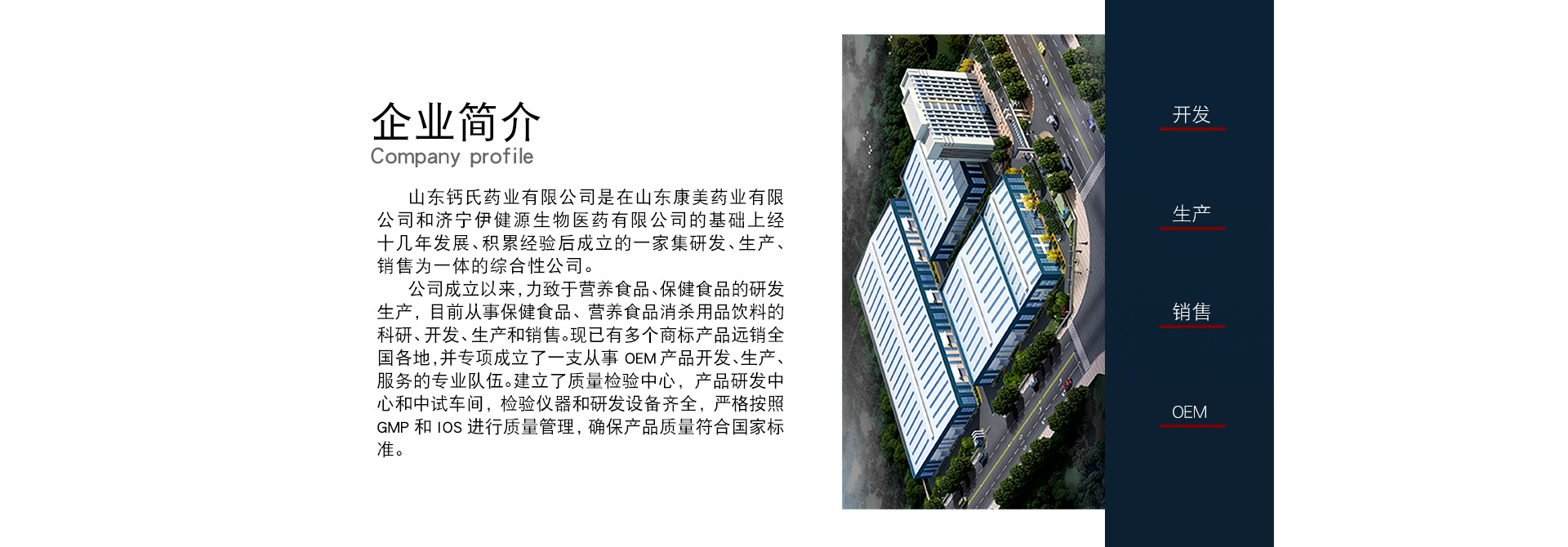 山東鈣氏藥業(yè)有限公司是在山東康美藥業(yè)有限公司和濟(jì)寧伊健源生物醫(yī)藥有限公司的基礎(chǔ)上經(jīng)十幾年的發(fā)展、積累經(jīng)驗(yàn)后成立的一家集研發(fā)、生產(chǎn)、銷售為一體的綜合性公司。工廠坐落于山東省濟(jì)寧市唐口工業(yè)園區(qū)內(nèi),自然環(huán)境優(yōu)越是保健食品、營養(yǎng)食品生產(chǎn)基地,現(xiàn)有GMP標(biāo)準(zhǔn)廠房和SC認(rèn)證車間,規(guī)范的實(shí)驗(yàn)室。公司所在地交通便利,距濟(jì)徐高速公路5公里,濟(jì)寧機(jī)場6公里,火車站15公里鐵路運(yùn)輸可達(dá)全國。廠區(qū)占地面積28000平方米,綜合辦公樓5800平方米,總投資3億元人民幣。 公司自成立以來,力致于營養(yǎng)食品、保健食品的研發(fā)生產(chǎn),利用已有的強(qiáng)大科研力量、健全的科研體系、現(xiàn)代化整合營銷管理方式以及龐大的市場營銷網(wǎng)絡(luò),形成了研發(fā)、生產(chǎn)、銷售為一體的現(xiàn)代化科技企業(yè)。公司目前主要從事保健食品、營養(yǎng)食品、消殺用品、飲料的科研、開發(fā)、生產(chǎn)和銷售。現(xiàn)已有多個商標(biāo)產(chǎn)品遠(yuǎn)銷全國各地,并專項(xiàng)成立了一支從事OEM產(chǎn)品開發(fā)、生產(chǎn)、服務(wù)的專業(yè)隊(duì)