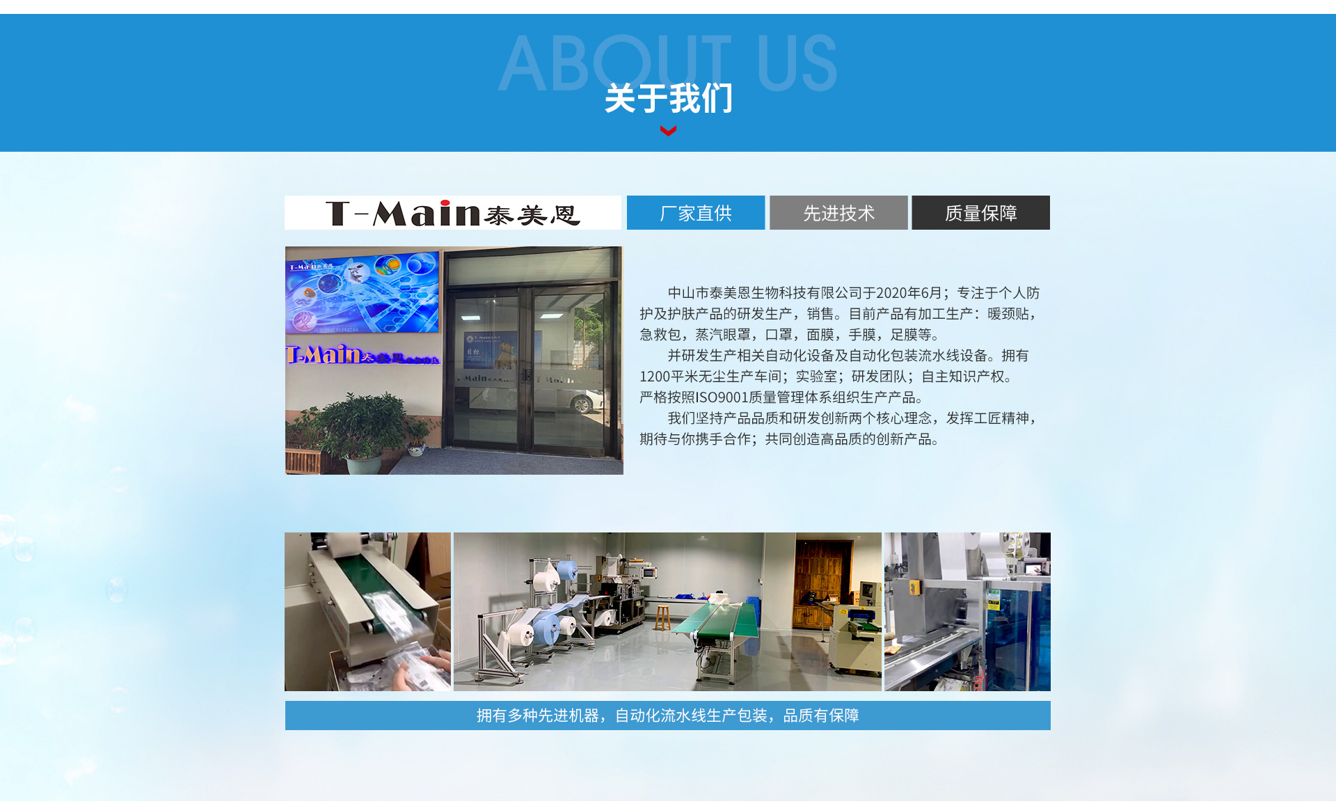 中山市泰美恩生物科技有限公司是口罩、手膜足膜、3D面膜、蒸汽眼罩、熱敷貼等產品專業生產加工的公司,擁有完整、科學的質量管理體系。中山市泰美恩生物科技有限公司的誠信、實力和產品質量獲得業界的認可。歡迎各界朋友蒞臨參觀、指導和業務洽談。