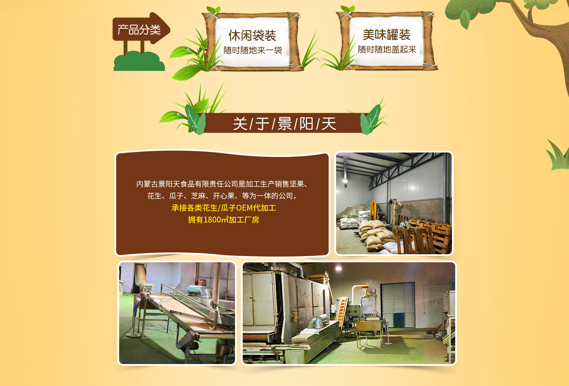 內(nèi)蒙古景陽天食品有限責(zé)任公司是堅(jiān)果、花生、瓜子、芝麻、開心果、松子等產(chǎn)品生產(chǎn)加工的公司,線下12年生產(chǎn)加工經(jīng)驗(yàn),支持OEM加工,一體化定制代工,擁有完整、科學(xué)的質(zhì)量管理體系。內(nèi)蒙古景陽天食品有限責(zé)任公司的誠信、實(shí)力和產(chǎn)品質(zhì)量獲得業(yè)界的認(rèn)可。歡迎各界朋友蒞臨參觀、指導(dǎo)和業(yè)務(wù)洽談