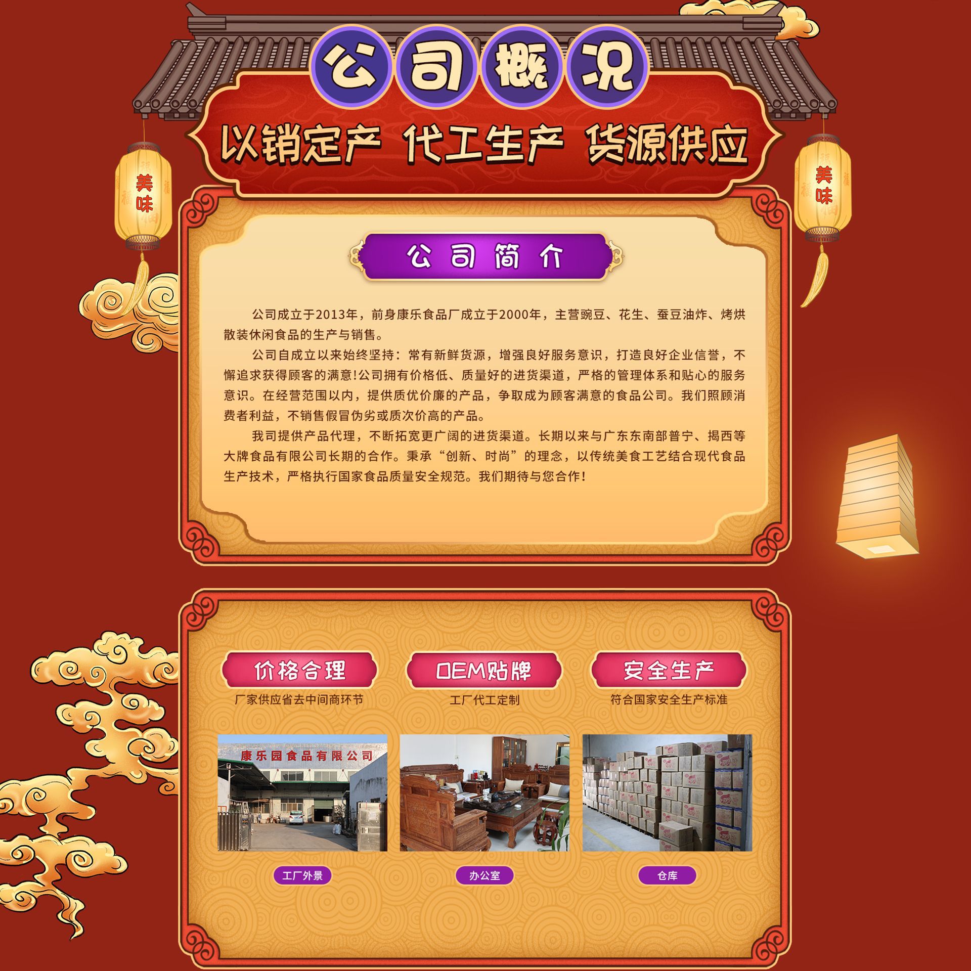 肇慶市鼎湖區康樂園食品有限公司位于廣東省中部偏西,陸路距廣州70公里,水路距香港120海里,交通十分便利,已建設成為粵港澳大灣區面向大西南樞紐門戶城市,公司成立于2013年,前身康樂食品廠成立于2000年,主營豌豆、花生、蠶豆油炸、烤烘散裝休閑食品的生產與銷售。 公司自成立以來,始終堅定統一信念:時刻保證新鮮貨源,增強一流服務意識,打造良好企業信譽,不懈追求顧客的滿意!公司擁有價格更低、質量更好的進貨渠道,嚴格的管理體系和很強的服務理念。在經營范圍以內,堅決提供質優價廉的產品,精心打造顧客滿意品牌。公司始終堅持消費者利益高于一切,堅決杜絕假冒偽劣或質次價高的產品。 康樂園食品有限公司成立至今就一貫致力于提供物美價廉的產品的代理,致力于拓寬更廣闊優質貨源的進貨渠道,致力于打造客戶滿意、放心的品牌企業。公司主營各種各種豌豆、花生、蠶豆油炸、烘烤系列休閑食品,長期以來與廣東東南部普
