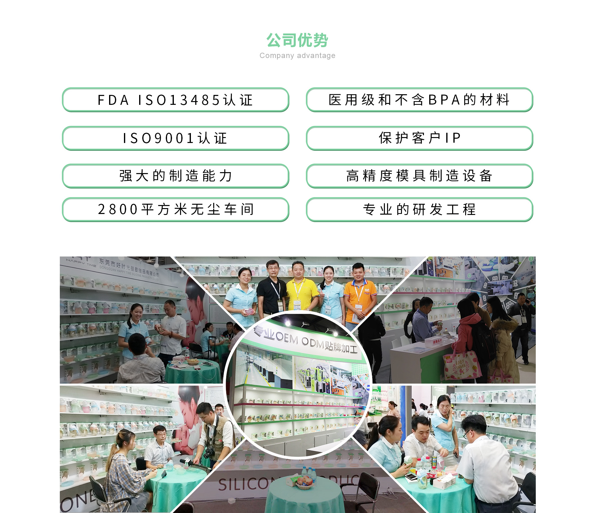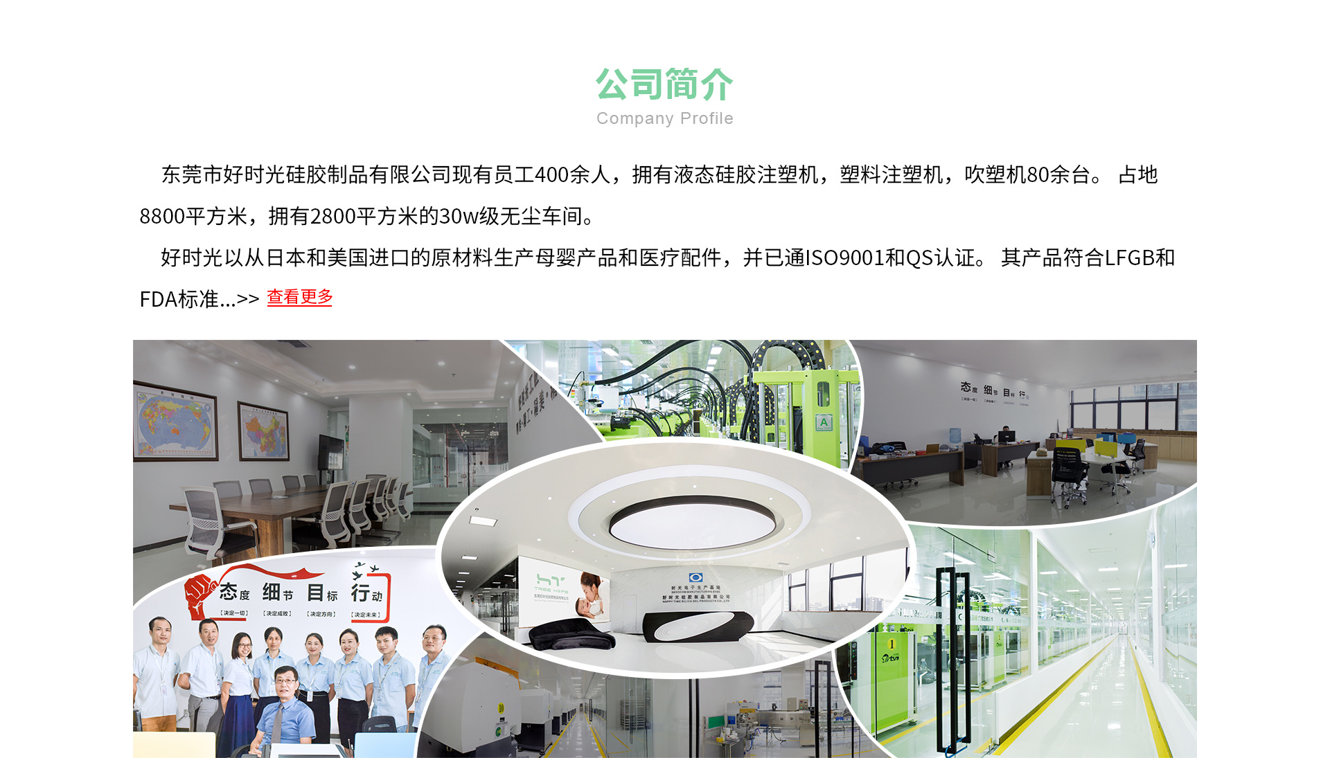 公司簡介:東莞市好時光硅膠制品有限公司是深圳市時光電子有限公司全資子公司。時光電子創(chuàng)立于1998年,是一家集自主研發(fā)、生產(chǎn)、銷售為一體的國家高新技術(shù)企業(yè)。公司抓住粵港澳大灣區(qū)建設(shè)發(fā)展機遇,勵志在硅膠制品、母嬰用品、醫(yī)療配件等,成立了東莞市好時光硅膠制品有限公司。 好時光公司坐落于生態(tài)良好、環(huán)境優(yōu)美、配套設(shè)施齊全的松湖智谷產(chǎn)業(yè)園區(qū)。擁有員工400多人(研發(fā)人員19名 、工程師21名、質(zhì)量管理26名、測試人員31名),設(shè)備有:硅膠機、注塑機、吹瓶機等大型模具制造設(shè)備超過80臺。在設(shè)備配備方面,有日本進口的CNC、沙迪克火花機等精密加工設(shè)備。公司有嚴(yán)格的制程管控,和精密的檢測設(shè)備。公司總面積8800平方米現(xiàn)代化、標(biāo)準(zhǔn)化生產(chǎn)車間,其中有2800平方米為30w級的無塵車間,主要以日本、美國進口液態(tài)硅膠為主的原料,生產(chǎn)母嬰產(chǎn)品和醫(yī)療配件兩大系列產(chǎn)品。公司通過了ISO9001和產(chǎn)品生產(chǎn)許可