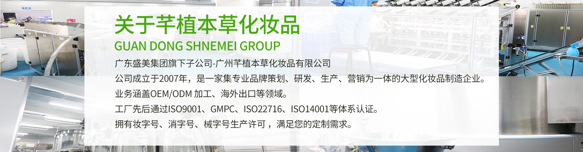 廣東盛美健康產(chǎn)業(yè)集團旗下子公司-廣州芊植本草化妝品有限公司,公司成立于2007年,是一家集專業(yè)品牌策劃、研發(fā)、生產(chǎn)、營銷為一體的大型化妝品制造企業(yè)。公司先后通過ISO9001、GMPC、ISO22716、ISO14001等體系認證,公司廠房面積超過3萬平方米,擁有GMPC專業(yè)生產(chǎn)線36條、7000多個已推出市場的成熟配方,擁有妝字號、消字號、健字號生產(chǎn)許可,滿足您定制需求