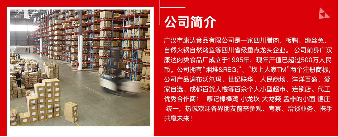 廣漢市康達食品有限公司是一家四川臘肉、板鴨、纏絲兔等四川特色食品的企業,是經國家相關部門批準注冊的企業。公司位于中國四川廣漢市廣漢市興隆鎮,與享譽中外的三星堆遺址毗鄰。這里空氣清新,環境優美,交通方便,是沒有工業污染的天然食品生產基地。 公司前身廣漢康達肉類食品廠成立于1995年,廣漢市質量協會會員單位,經過十余載的發展,現年產值已超過500萬人民幣。公司擁有“煙堆®”、“坎上人家TM”兩個注冊商標,主要產品有纏絲兔、板鴨、脆皮雞、香腸(川味、廣味)、四川臘肉等十余種,公司產品遍布沃爾瑪、世紀聯華、人民商場、洋洋百盛、愛家自選、成都百貨大樓等百余個大小型超市、連鎖店。 公司生產部門位于川西平原北部廣漢興隆鎮西林村,川西平原農村以無污染、無公害的綠色食品而聞名.