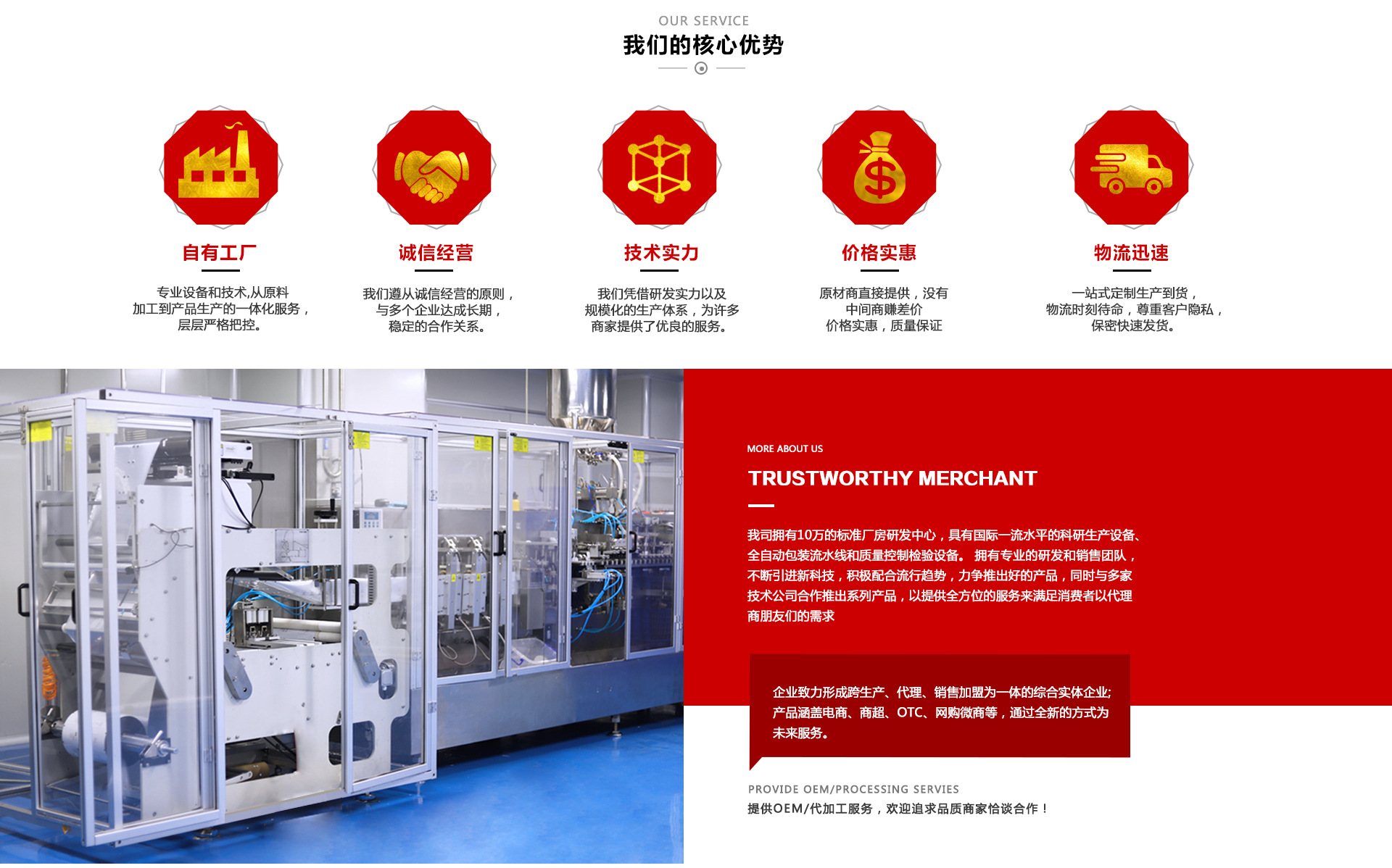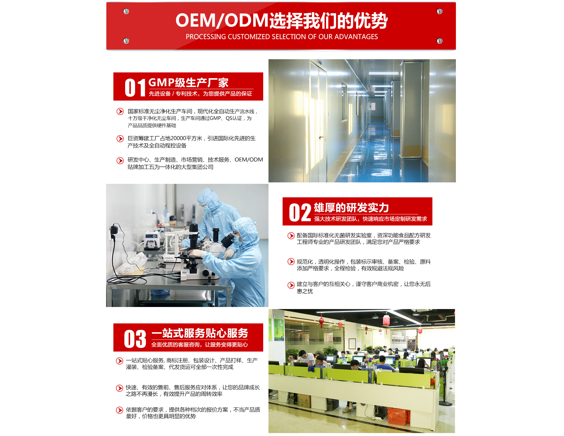 廣州萬康醫藥科技有限公司是一家集研發,制造,銷售,服務以及大健康文化傳播于一體的專業OEM/ODM高新科技綜合性企業,是專業實效加工領航者,公司提供固體飲料,壓片糖果,膠原蛋白,酵素,代餐,牡蠣,瑪咖等待的保健營養食品加工及成品,同時可為客戶提供OEM定制的多元成份保健食品,我司全心全意為幫助品牌實現省心,省力,省錢服務。