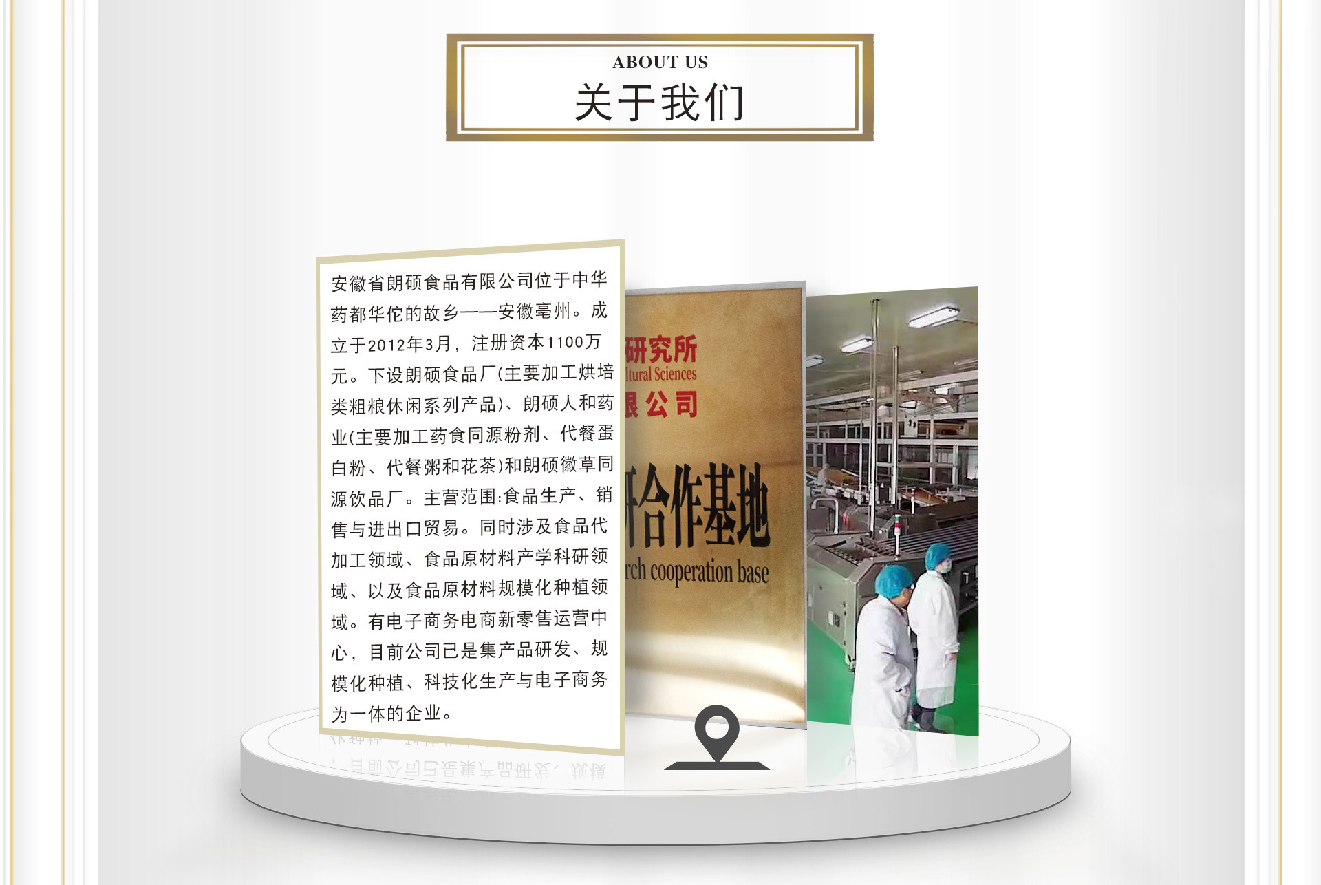 安徽朗碩食品有限公司注冊地位于渦陽縣陳大工業園區,注冊成立于2012年3月,注冊資金1100 。公司主要生產烘焙類食品、休閑食品、兒童食品、藥食同源類功能性健康食品等系列產品,公司集新產品的開發及市場銷售、電子商務、微商社交新零售和OIM貼牌代工業務。 我公司從原材料種植到原材料加工再到成品加工全程采用綠色無公害的種植及加工工藝,從種植原料到加工食品采用全程監控,做到放心食品的標準。公司現擁有2條全自動烘焙食品生產流水線,30臺套健康食品生產設備,車間面積16000平方米,日加工能力達到6噸。2019年公司在渦陽縣經濟開發區又新成立了功能性健康食品生產廠房,讓產品更豐富,渠道更完善,同時自由社交新零售運營模式成功起盤。