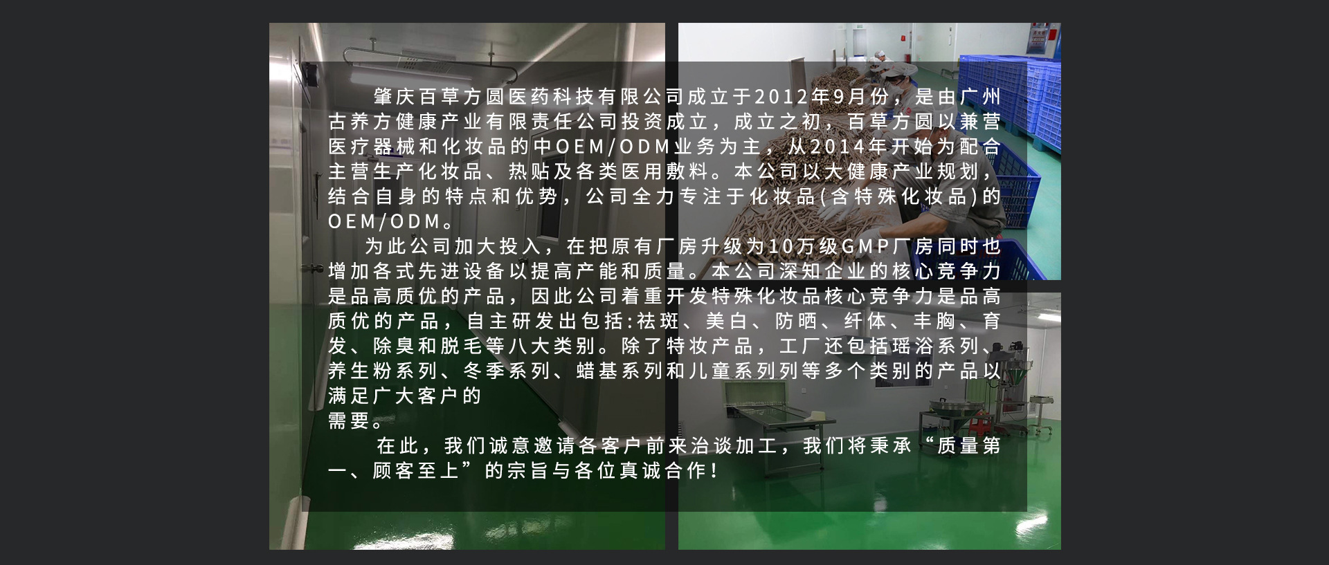 肇慶百草方圓醫藥科技有限公司成立于2012年9月份,是由廣州古養方健康產業有限責任公司投資成立,成立之初,百草方圓以兼營醫療器械和化妝品的中OEM/ODM業務為主,從2014年開始為配合主營生產化妝品、熱貼及各類醫用敷料。本公司以大健康產業規劃,結合自身的特點和優勢,公司全力專注于化妝品(含特殊化妝品)的OEM/ODM。 為此公司加大投入,在把原有廠房升級為10萬級GMP廠房同時也增加各式先進設備以提高產能和質量。本公司深知企業的核心競爭力是品高質優的產品,因此公司著重開發特殊化妝品核心競爭力是品高質優的產品,自主研發出包括:祛斑、美白、防曬、纖體、豐胸、育發、除臭和脫毛等八大類別。除了特妝產品,工廠還包括瑤浴系列、養生粉系列、冬季系列、蠟基系列和兒童系列列等多個類別的產品以滿足廣大客戶的需要。