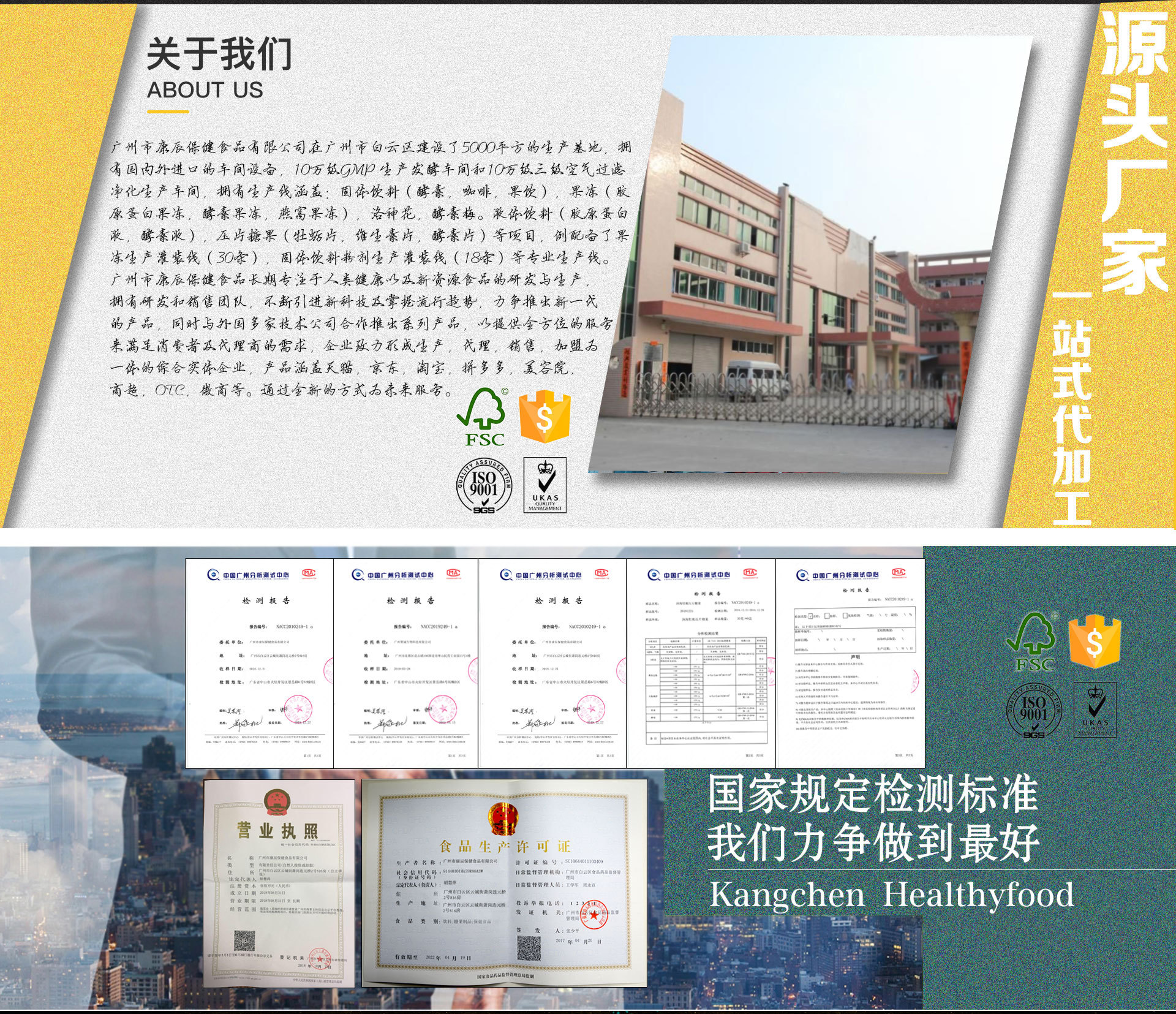 廣州市康辰保健食品有限公司是口服液、壓片糖果、粉劑、果凍、軟糖等產品專業生產加工的公司,擁有完整、科學的質量管理體系。廣州市康辰保健食品有限公司的誠信、實力和產品質量獲得業界的認可。歡迎各界朋友蒞臨參觀、指導和業務洽談。