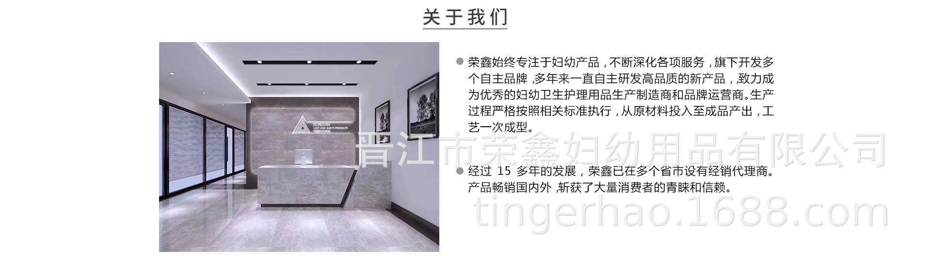 晉江市榮鑫婦幼用品有限公司,成立于2020年,位于品牌之都福建晉江。 經營范圍包括制造:衛生巾、尿褲、尿布、濕巾、無紡布、合成材料、非醫用日用防護口罩、醫用防護口罩;批發零售:機械設備及零配件、非醫用日用防護口罩、醫用防護口罩;貨物或技術的進出口(國家禁止或涉及行政審批的貨物或技術進出口除外)。 生產種類齊全,品質優異,均采用進口優質的材料生產而成。面對市場的競爭,我公司擁有一支實力超凡的市場分析人員和銷售人員,勇于開拓,致力服務廣大消費者。在銷售的背后,同時擁有一隊強大的技術人員和先進的機械設備,不斷改良、創新,讓產品更加優良。我公司的婦女衛生用品,適合不同地方、不同身份、不同體形、不同流量的女性,力求讓消費者在特別的日子里擁有一份舒適、安心、自在的感覺。