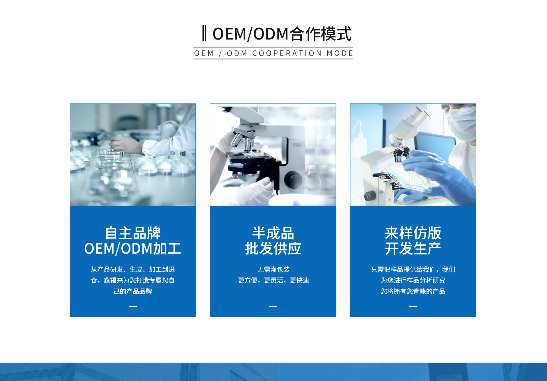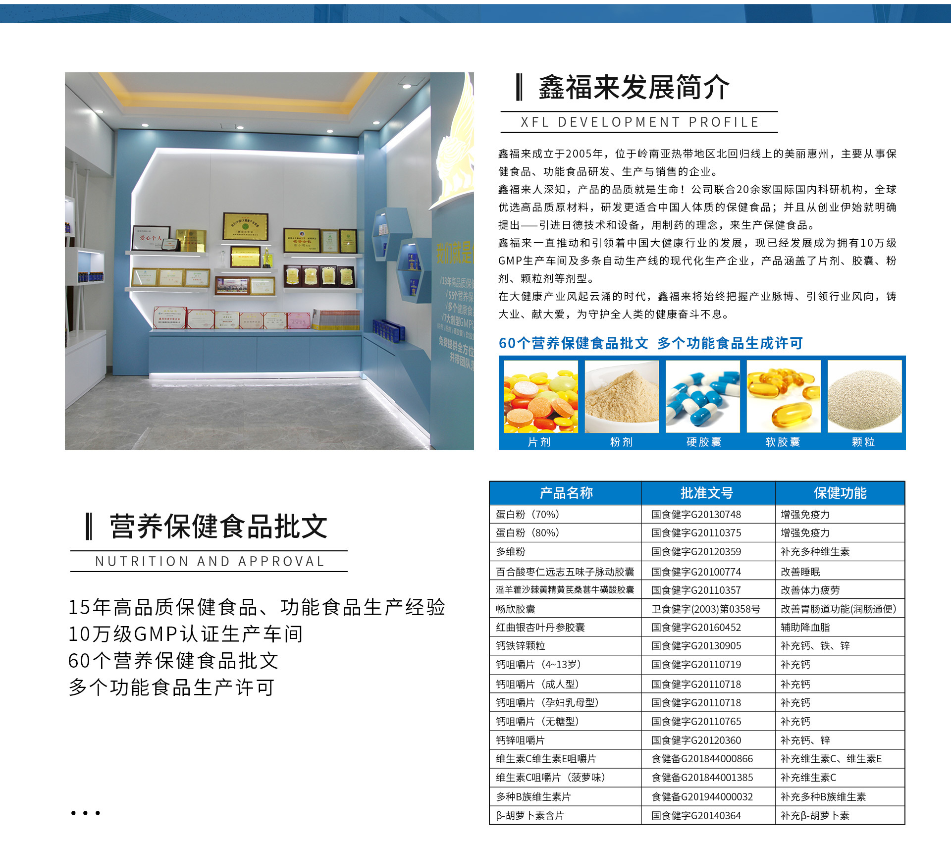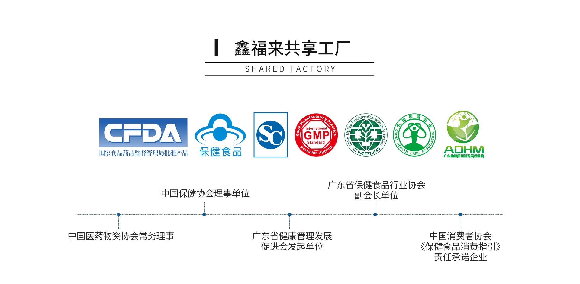 鑫福來共享工廠成立于2005年,擁有10萬級GMP凈化車間,用制藥的理念 生產產品 ,2014年12月30日,成功掛牌廣州股權交易中心 股權代碼:890787),中國醫藥物資協會常務理事 中國保健協會理事單位 廣東省健康管理發展促進會發起單位 廣東省保健食品協會副會長單位 中國消費者協會(保健食品消費指引)責任承諾企業。 業務:主要從事營養健康食品 功能性保健食品和營養補充劑的研發,生產, 銷售一體 。擁有300多個商標資源共享,多項發明專利 ,60多個保健品批文:如減肥,改善睡眠,美白,促進消化,降血脂,緩解體力疲勞,增強免疫力等保健品 2000多個功能食品,安神助眠類 抗糖抗衰類 調經補血類 滋補壯陽類 各種益生菌等。 專業為各大品牌公司,渠道 平臺 直銷,電商,微商等OEM代加工。