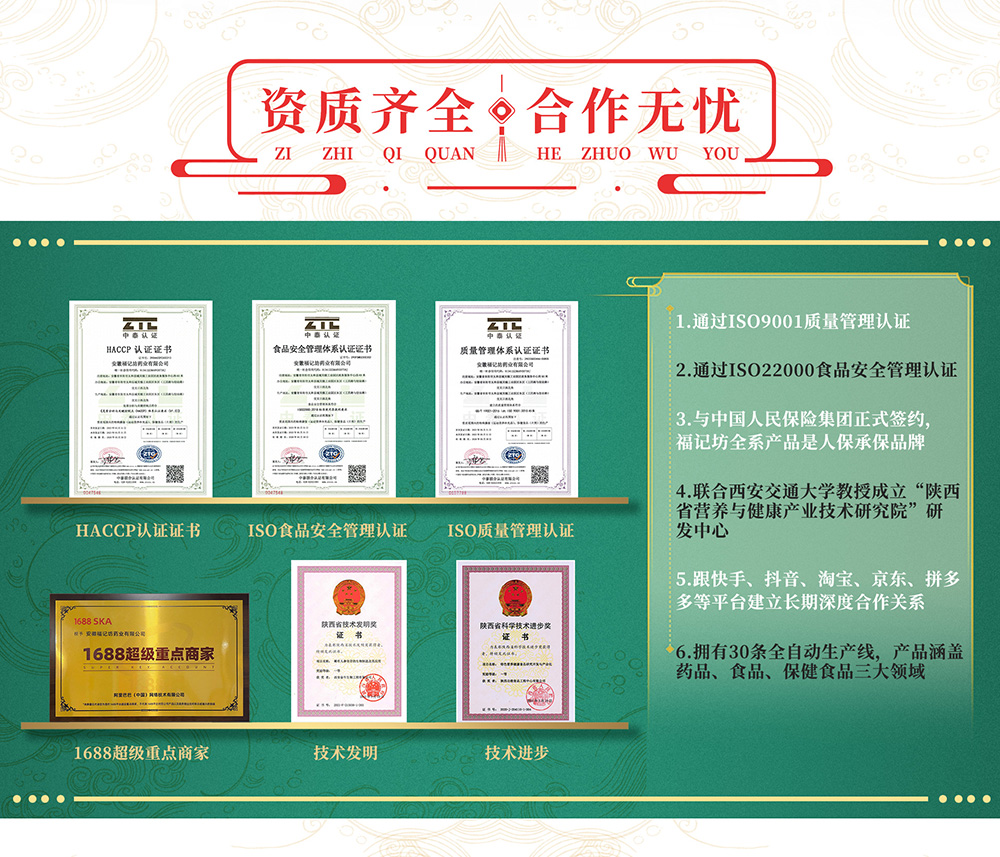 福記坊核心優(yōu)勢:30 高級研發(fā)人才、32類產品種類、800 可生產產品、45000㎡自主生產車間、30000㎡無菌標準車間、2000 經銷商、3.6萬㎡生產基地、30 進口生產線、10萬 日產量、10萬級凈化車間、100 國食健字批文、100 食健字批文、10余所研發(fā)合作大學(徽中醫(yī)藥大學、中國中醫(yī)科學院等大學),企業(yè)員工300 。 福記坊承接貼牌代加工,合作品牌:仁和,同仁堂,廣藥白云山,修正,江中等。