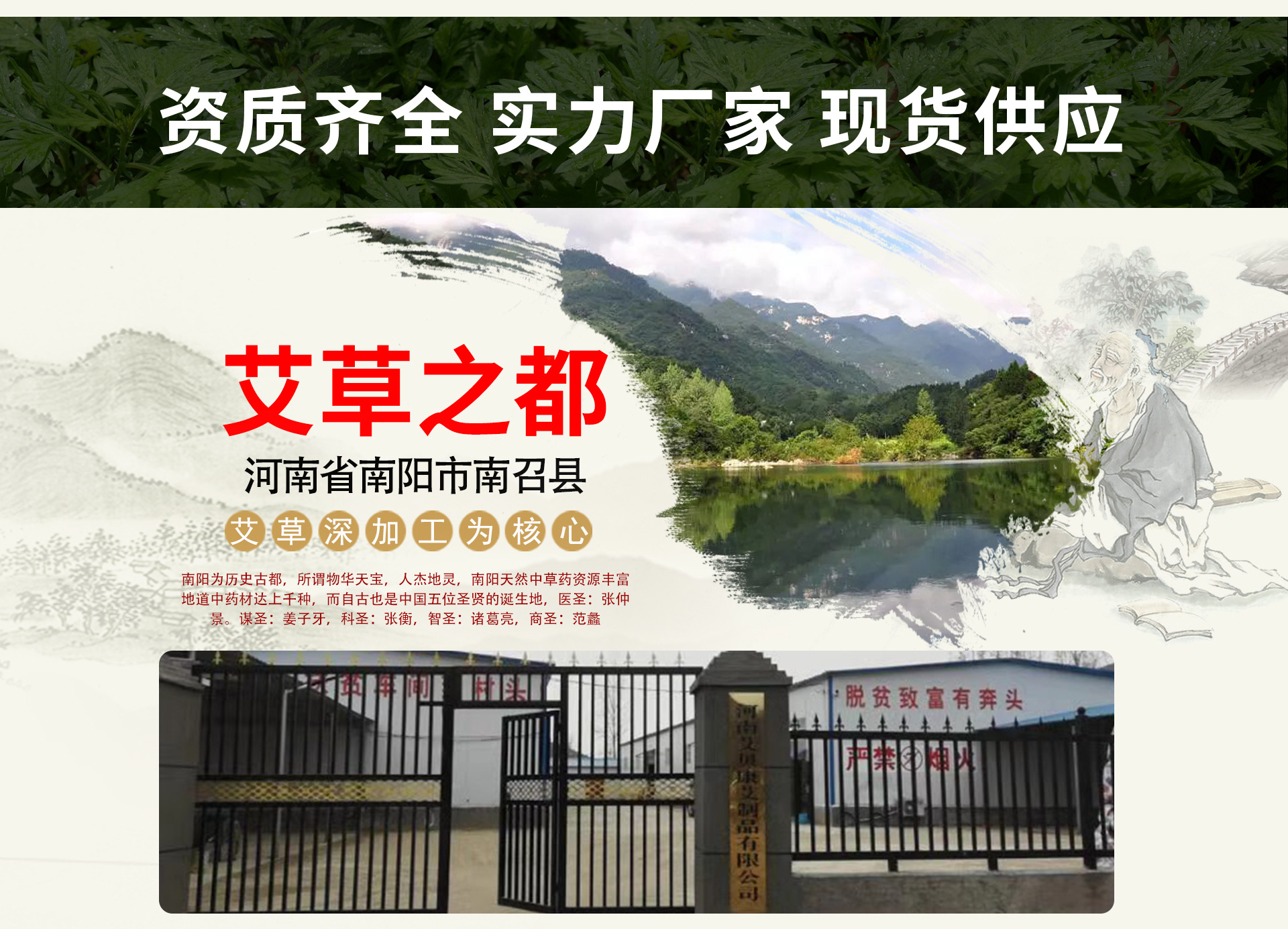河南艾貝康艾制品有限公司 ,是一家以艾草深加工為核心,涉及健康養生、連鎖加盟,技術培訓等領域的綜合性公司。 南陽是艾草之都,公司就坐落在河南省南陽市,廠房占地面積3000多平方,公司做為南陽市扶貧示范企業由政府重點扶持。南陽為歷史古都,所謂物華天寶,人杰地靈,南陽天然中草藥資源豐富,地道中藥材達上千種,而自古也是中國五位圣賢的誕生地,醫圣:張仲景。謀圣:姜子牙,科圣:張衡,智圣:諸葛亮,商圣:范蠡,富有淳厚的文化底蘊和豐富的歷史積淀,其中最令人驕傲的是醫圣張仲景。艾貝康艾制品有限公司,在集團創始人黃太金的帶領下,公司開拓創新,蒸蒸日上。優質的產品要從生產源頭抓起,我們的研發團隊精選南陽本地區優質野艾草,成立農村艾草種植合作社,簽約農戶達上千余戶。同時也實現了艾草加工生產一體化,現已擁有上萬畝優質艾草種植基地和標準化的艾制品,艾灸產品生產車間。