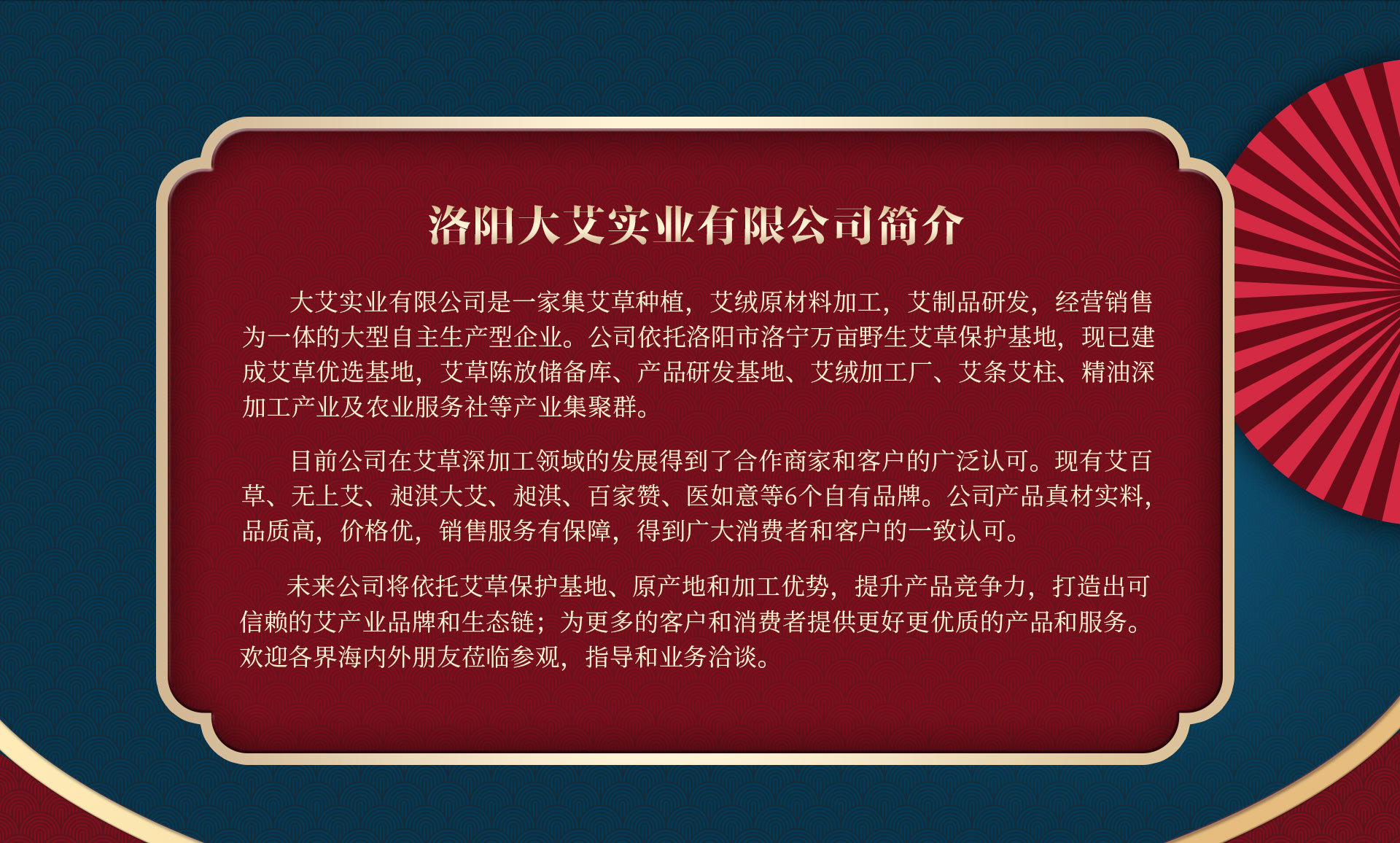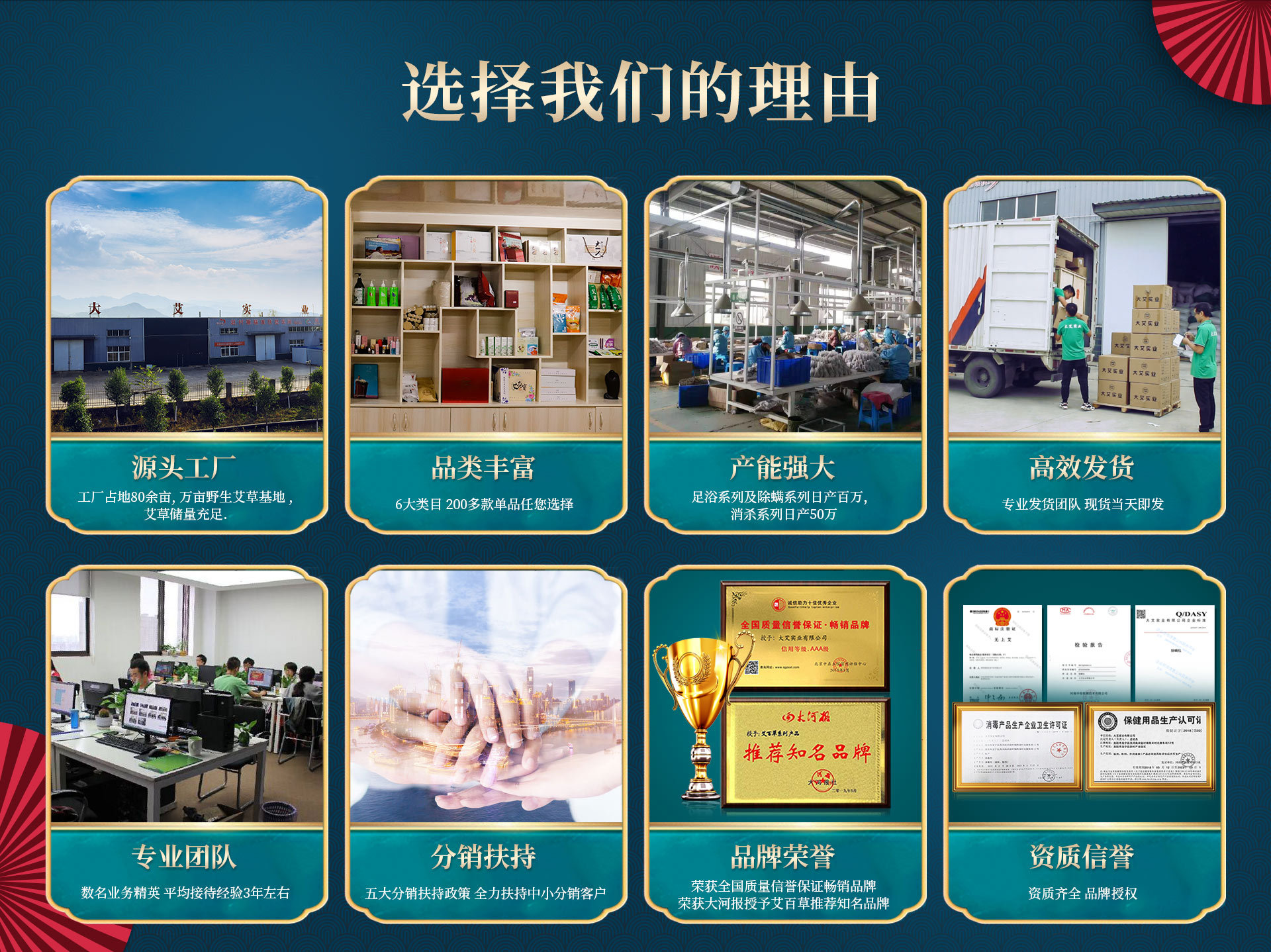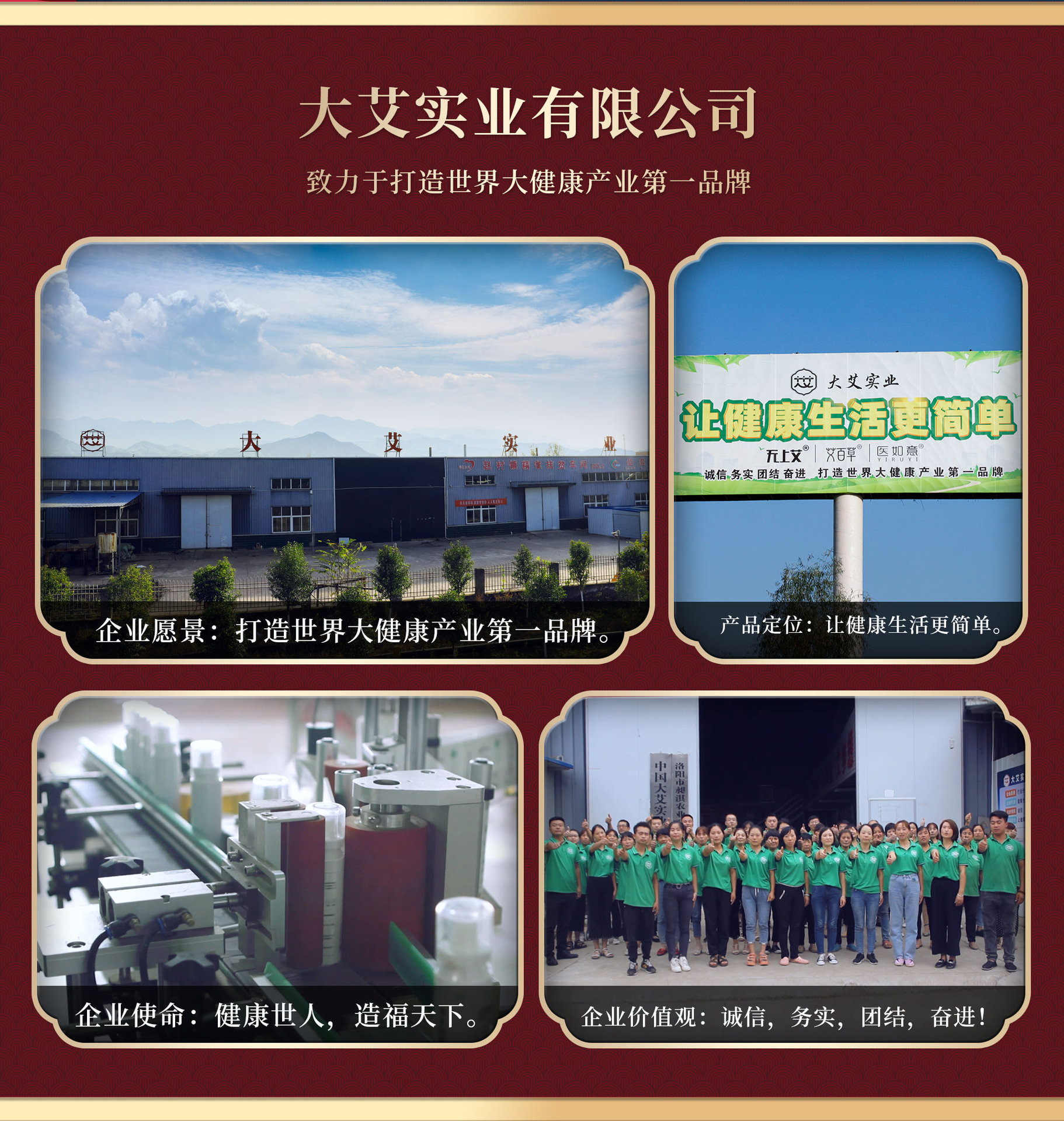大艾實業有限公司 致力于打造世界大健康產業第一品牌 工廠占地80余畝 公司位于:洛陽·洛寧·伏牛山脈生態區 主營品牌:醫如意 艾百草 無上艾等 有足浴熏蒸系列、除螨降醛系列、消毒殺劑、艾柱艾條等產品。 擁有自主研發團隊,萬畝野生艾草基地 中醫藥材集聚,秉承結合傳統中醫文化 用成就客戶、幸福員工、健康世人的理念做好產品 現已和仁和、修正、同仁堂、雷允上等知名品牌取得合作 足浴系列及除螨系列日產百萬,消殺系列日產50萬,可承接大量OEM,可做一件代發、分銷代理等業務 大艾實業 讓健康生活更簡單。