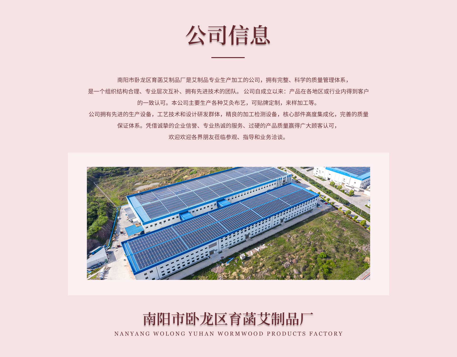南陽市臥龍區育菡艾制品廠是艾制品專業生產加工的公司,擁有完整、科學的質量管理體系,是一個組織結構合理、專業層次互補、擁有領先技術的團隊。 公司自2012年成立以來:產品在全國地區或行業內得到客戶的一致認可。本公司主要生產各種艾灸布藝,可貼牌定制,來樣加工等。公司擁有先進的生產設備,工藝技術和設計研發群體,精良的加工檢測設備,核心部件高度集成化,完善的質量保證體系。憑借誠摯的企業信譽、專業熱誠的服務、過硬的產品質量贏得廣大顧客認可,歡迎歡迎各界朋友蒞臨參觀、指導和業務洽談。
