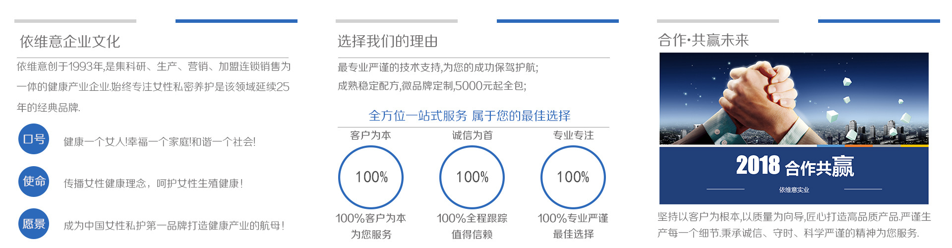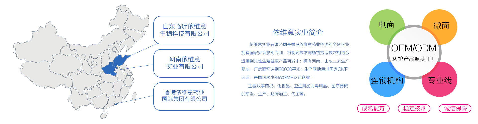 河南依維意實業有限公司是一家香港依維意藥業集團控股的全資民營制藥企業,前身博達公司創始于1993年,擁有國家多項發明專利,將制藥技術及植物提取技術完美的運用到女性生殖健康護理產品的研發中。國內擁有河南,山東三家生產基地,廠房面積達到20000平米,生產基地通過國家GMP認證,是國內極少的雙GMP認證企業,擁有10萬凈化車間3000平方米,主要從事藥妝、化妝品、衛生用品、消毒用品、醫療器械的研發、生產、銷售,醫藥技術的技術咨詢。 生產品種有: 婦科凝膠OEM/ODM、縮陰凝膠OEM/ODM、泡沫洗液、私處護理產品、臭氧油系列、足部護理系列、眼貼類、灰指甲類、口腔噴劑、痔瘡凝膠等。